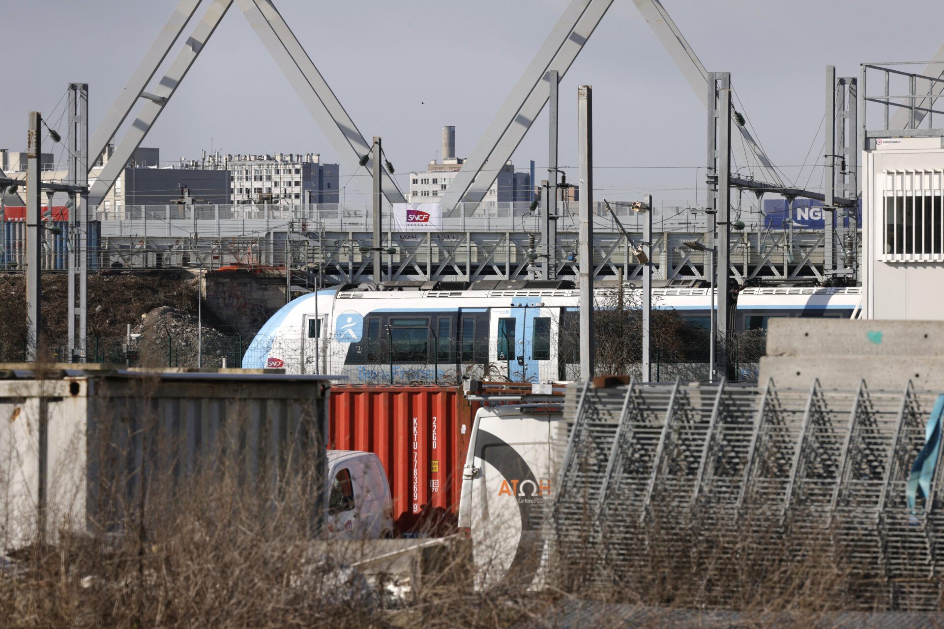 รถไฟภูมิภาคจอดอยู่บนรางรถไฟในเมืองแซ็งต์-เดอนี ทางตอนเหนือของกรุงปารีส ประเทศฝรั่งเศส เมื่อวันที่ 7 มีนาคม หลังจากพบระเบิดสมัยสงครามโลกครั้งที่ 2 บนรางรถไฟที่มุ่งหน้าสู่สถานีรถไฟการ์ดูนอร์ด (Photo by GEOFFROY VAN DER HASSELT / AFP)