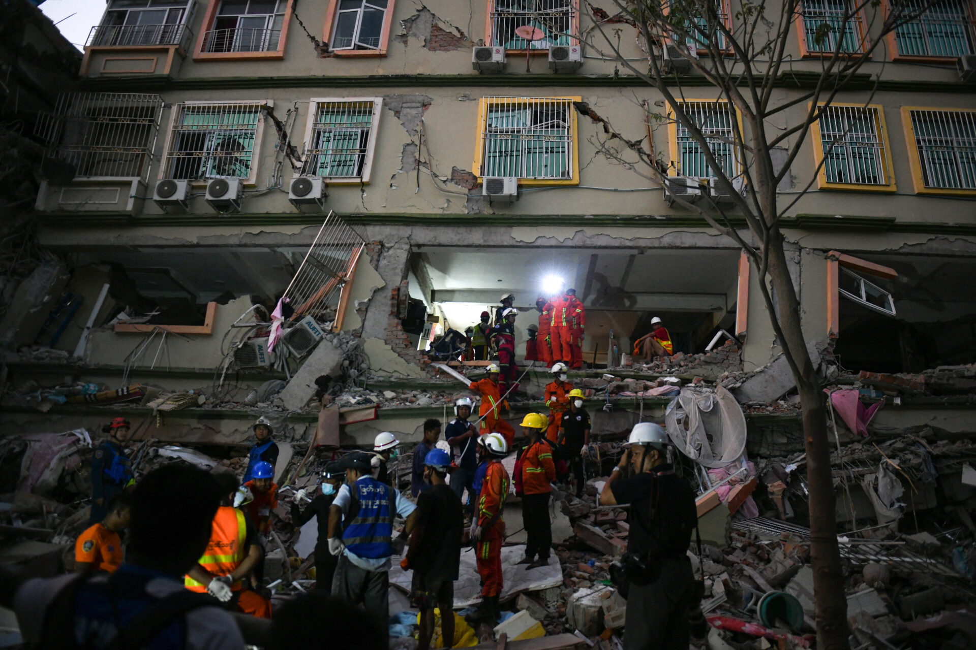 เจ้าหน้าที่กู้ภัยทำงานเพื่อช่วยเหลือผู้อยู่อาศัยที่ติดอยู่ใต้ซากปรักหักพังของอาคารคอนโดมิเนียมสกายวิลลาที่ถล่มลงมาในเมืองมัณฑะเลย์ เมื่อวันที่ 30 มีนาคม (Photo by Sai Aung MAIN / AFP)