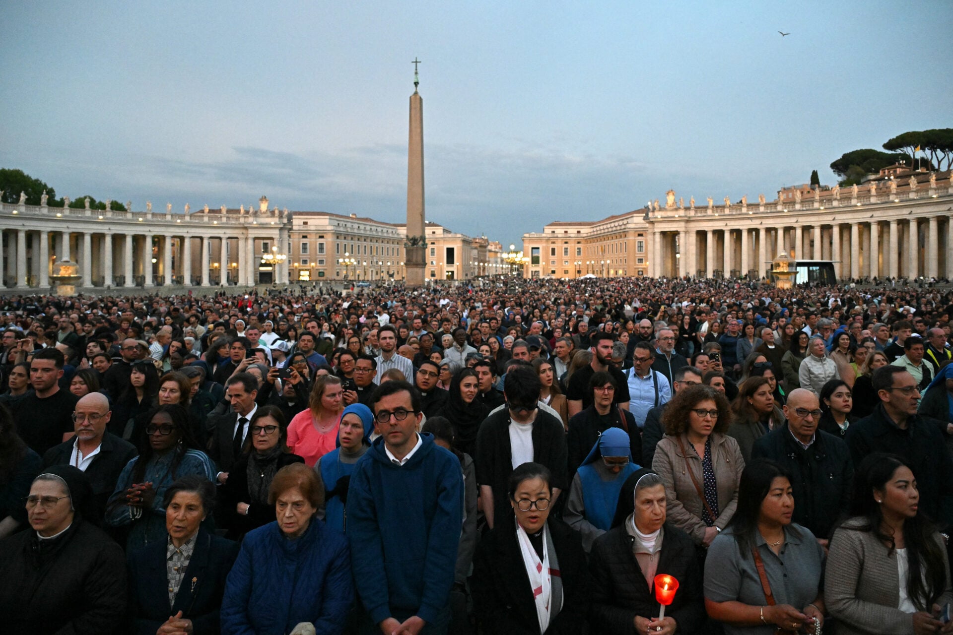 ผู้คนร่วมสวดภาวนาเพื่อถวายความเคารพแด่สมเด็จพระสันตะปาปาฟรานซิส ภายหลังการสิ้นพระชนม์ของพระองค์ ที่จัตุรัสเซนต์ปีเตอร์ในนครรัฐวาติกัน เมื่อวันที่ 21 เมษายน (Photo by Alberto PIZZOLI / AFP)