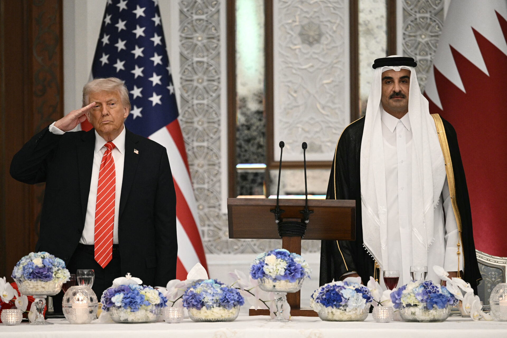 ชีค ทามิม บิน ฮาหมัด อัล-ธานี เจ้าผู้ครองรัฐกาตาร์ และประธานาธิบดีโดนัลด์ ทรัมป์ ของสหรัฐฯ ยืนขึ้นในตอนบรรเลงเพลงชาติสหรัฐฯ ก่อนงานเลี้ยงอาหารค่ำของรัฐ ที่พระราชวังลูเซลในกรุงโดฮา เมื่อวันที่ 14 พฤษภาคม (Photo by Brendan SMIALOWSKI / AFP)