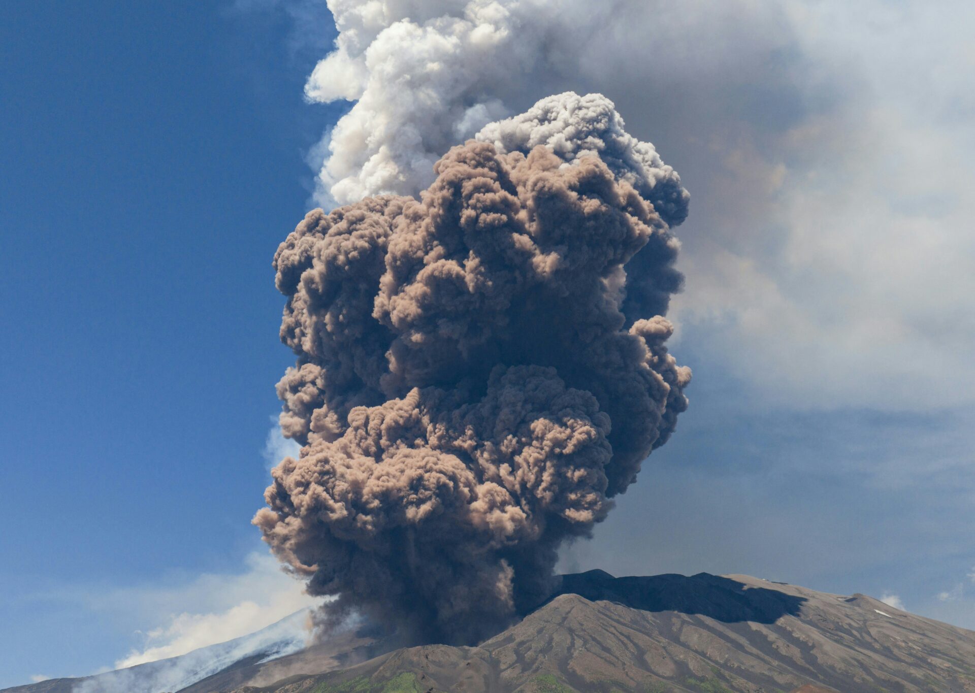 กลุ่มเถ้าถ่าน, ก๊าซ และหินจำนวนมหาศาลพวยพุ่งออกมาจากภูเขาไฟเอตนาในอิตาลี ซึ่งเป็นภูเขาไฟที่ยังคุกรุ่นอยู่ที่ใหญ่ที่สุดของยุโรป