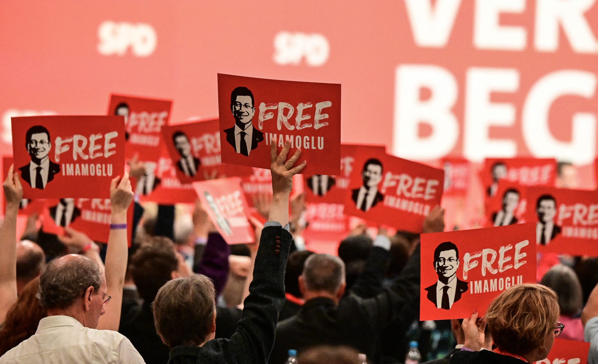 ผู้เข้าร่วมถือป้ายที่มีข้อความว่า "ปลดปล่อย อิมาโมกลู" ซึ่งหมายถึงการกักขังเอเครม อิมาโมกลู นายกเทศมนตรีเมืองอิสตันบูล เมื่อวันที่ 28 มิถุนายน (Photo by Tobias SCHWARZ / AFP)