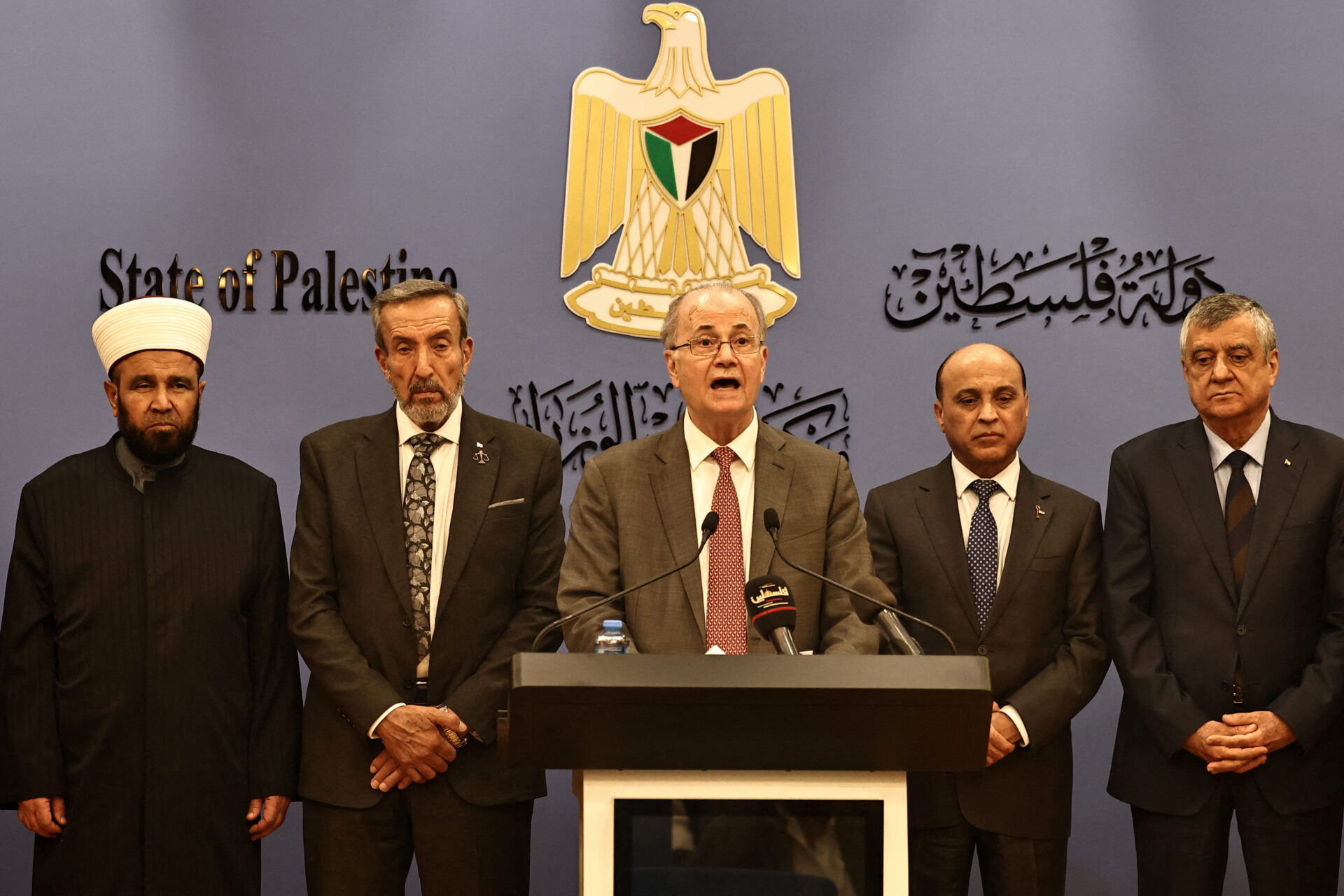 นายกรัฐมนตรีโมฮัมหมัด มุสตาฟา ของปาเลสไตน์ (กลาง) กล่าวระหว่างการแถลงข่าว ณ เมืองรามัลเลาะห์ ในเขตเวสต์แบงก์ที่ถูกอิสราเอลยึดครอง เมื่อวันที่ 21 กรกฎาคม (Photo by Zain JAAFAR / AFP)