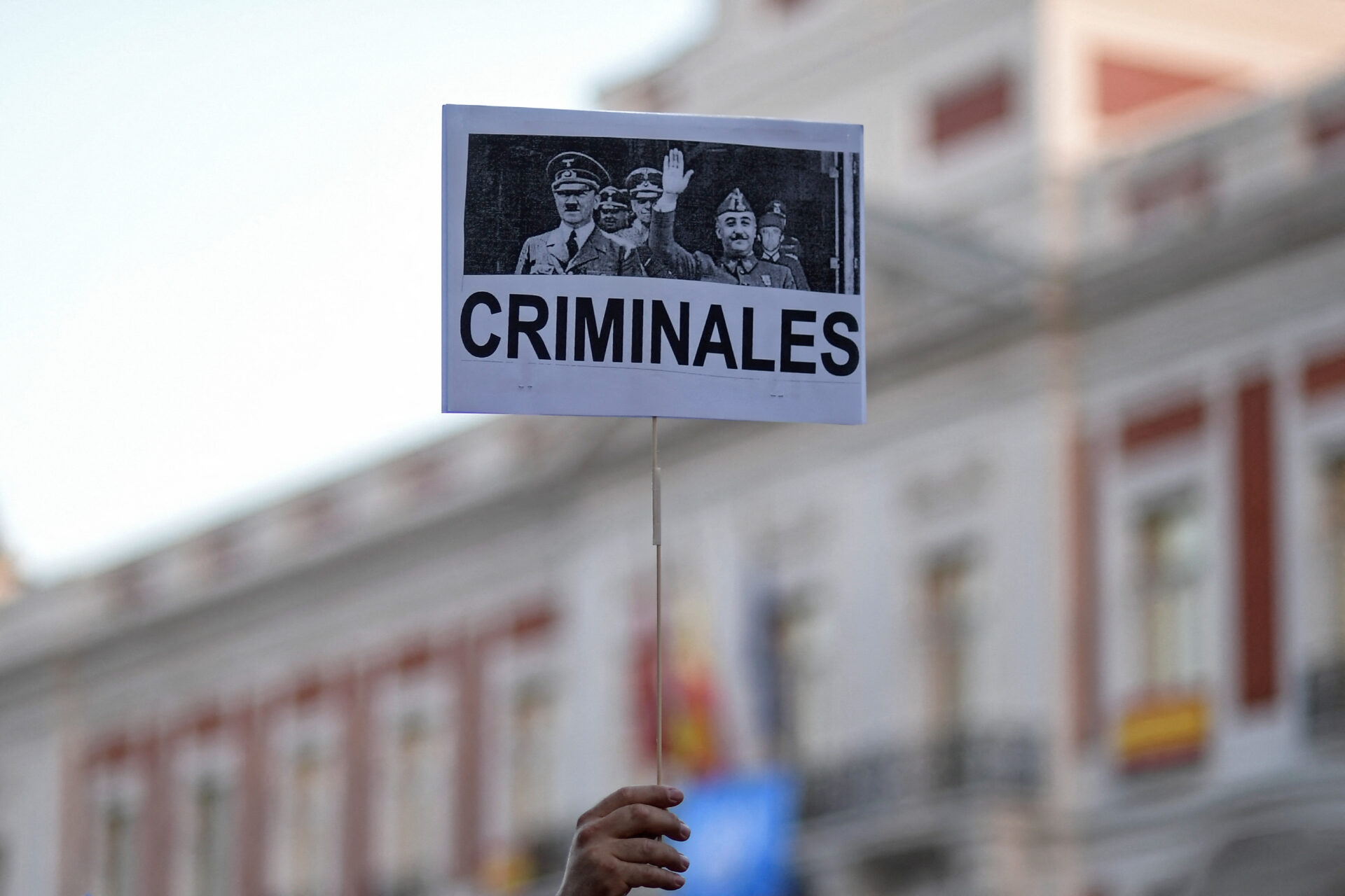 ป้ายแสดงรูปภาพของอดีตเผด็จการฟรานซิสโก ฟรังโกของสเปน และอดีตเผด็จการอดอล์ฟ ฮิตเลอร์ของเยอรมนี ระหว่างการชุมนุมประท้วงเมื่อปี 2018 ที่คัดค้านข้อเสนอที่จะย้ายอัฐิของนายพลฟรังโกไปยังอาสนวิหารอัลมูเดนา ในกรุงมาดริด – Photo by Oscar Del Pozo / AFP