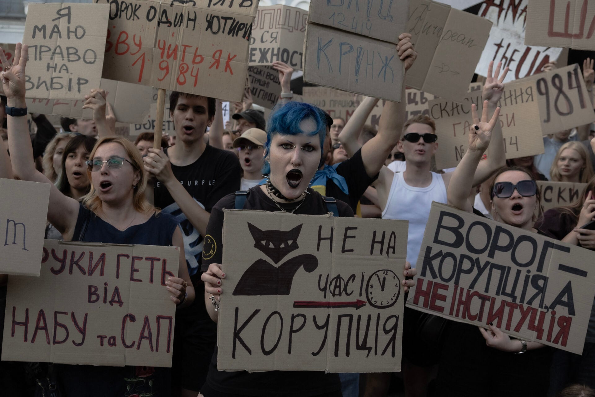 ในย่านใจกลางเมืองเคียฟ คนหนุ่มสาวพากันออกมาประท้วงต่อต้านกฎหมายใหม่ที่ลิดรอนความเป็นอิสระของหน่วยงานต่อต้านการทุจริตสองหน่วยงานสำคัญ และเรียกร้องให้ประธานาธิบดียูเครนใช้อำนาจยับยั้งกฎหมายฉบับนี้ นับเป็นการประท้วงครั้งใหญ่ที่สุดในเคียฟ นับตั้งแต่รัสเซียเริ่มทำสงครามรุกรานยูเครนในปี 2022 – Photo by Roman Pilipey / AFP