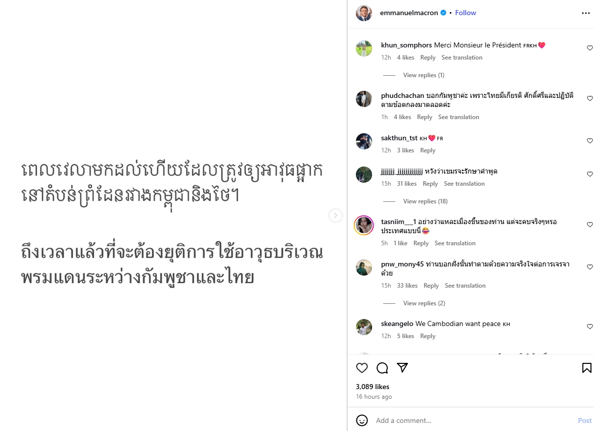29 ก.ค. 2568 – ประธานาธิบดีเอ็มมานูเอล มาครง ผู้นำฝรั่งเศส ได้โพสต์ข้อความเป็นภาษาไทยและภาษาเขมรผ่านอินสตาแกรมส่วนตัว (@emmanuelmacron) ที่ โดยเรียกร้องให้ยุติการใช้อาวุธบริเวณพรมแดน ในโพสต์ดังกล่าว