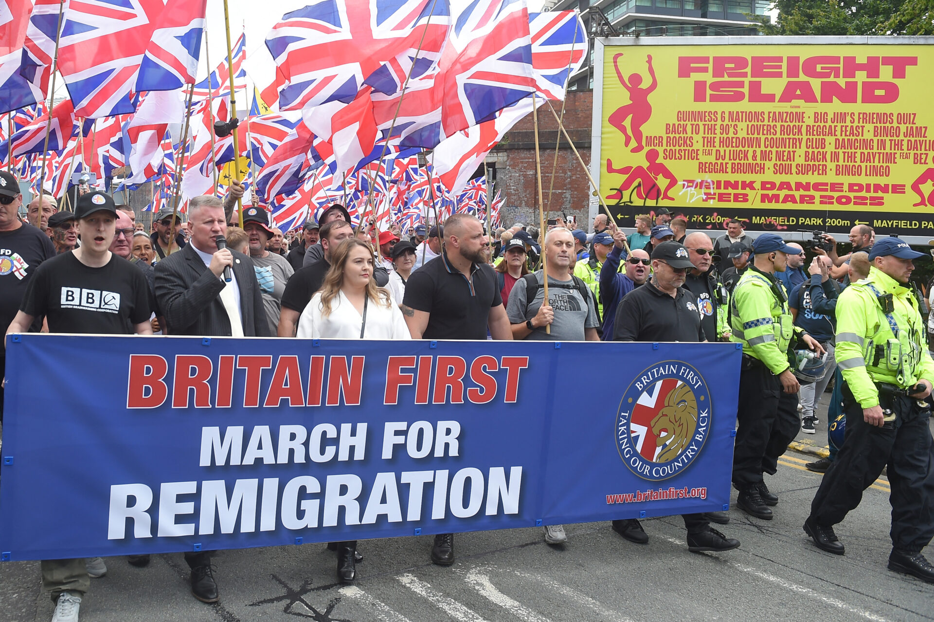 ผู้ประท้วงที่เรียกร้องให้มีการ "อพยพกลับ" ครั้งใหญ่ มารวมตัวกันที่ใจกลางเมืองแมนเชสเตอร์ ทางตะวันตกเฉียงเหนือของอังกฤษ เพื่อเข้าร่วมการเดินขบวนที่จัดโดยกลุ่มขวาจัด "Britain First" ซึ่งถูกกลุ่มต่อต้านการเหยียดเชื้อชาติประณาม