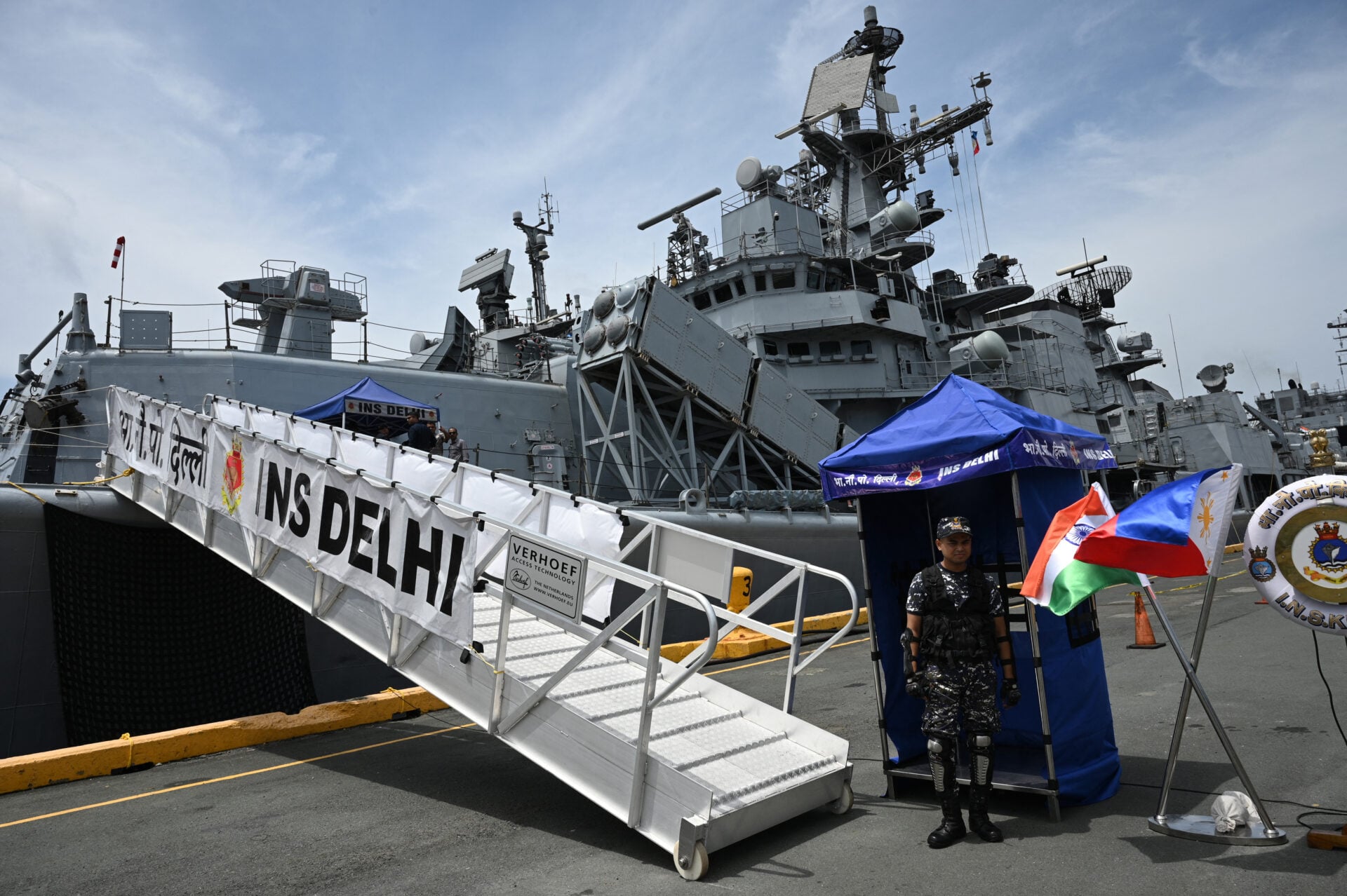 เรือพิฆาตติดขีปนาวุธนำวิถี 'INS Delhi' ของกองทัพเรืออินเดีย เทียบท่าที่ท่าเรือนานาชาติมะนิลา ประเทศฟิลิปปินส์ เมื่อวันที่ 1 สิงหาคม (Photo by Ted ALJIBE / AFP)