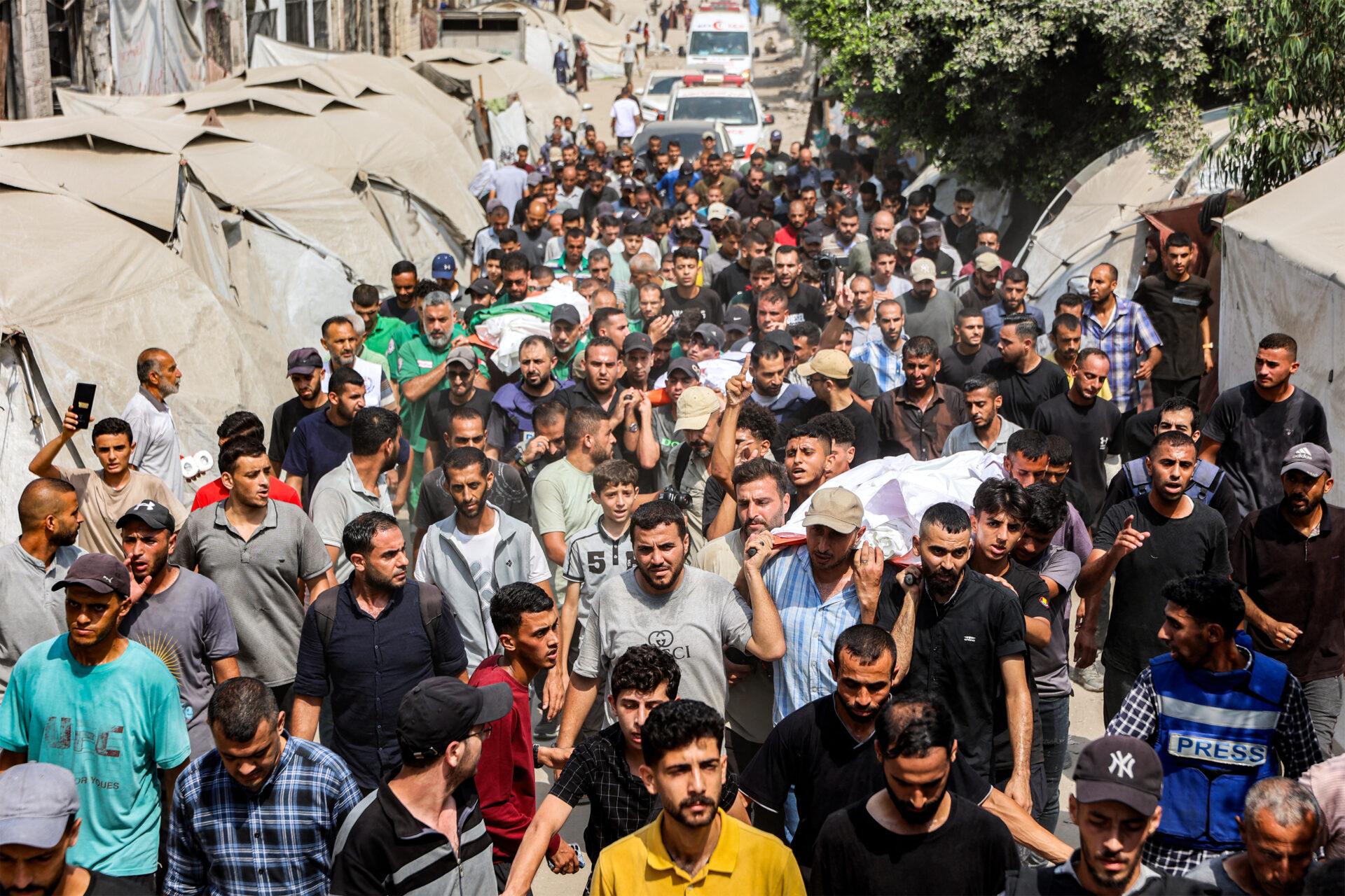 ชาวปาเลสไตน์ในกาซาซิตีเดินขบวนพร้อมศพนักข่าวอัลจาซีราที่เสียชีวิตจากการโจมตีของอิสราเอล เมื่อวันที่ 11 สิงหาคม (Photo by Omar AL-QATTAA / AFP)
