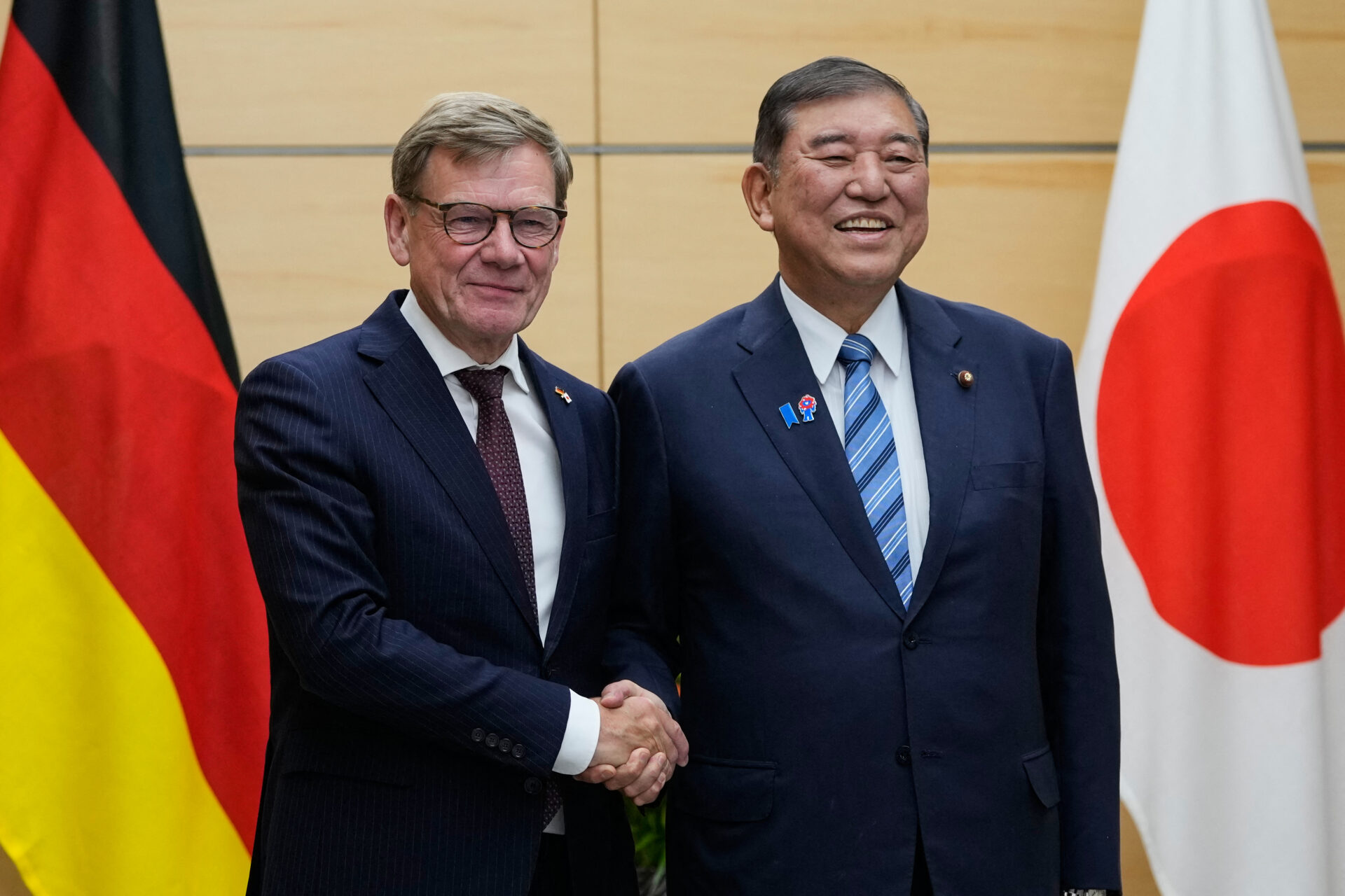 โยฮันน์ วาเดอฟูล รัฐมนตรีต่างประเทศเยอรมนี (ซ้าย) และนายกรัฐมนตรีชิเงรุ อิชิบะ ของญี่ปุ่นจับมือกันก่อนการประชุมที่สำนักงานนายกรัฐมนตรีในกรุงโตเกียว เมื่อวันที่ 18 สิงหาคม (Photo by Shuji Kajiyama / POOL / AFP)