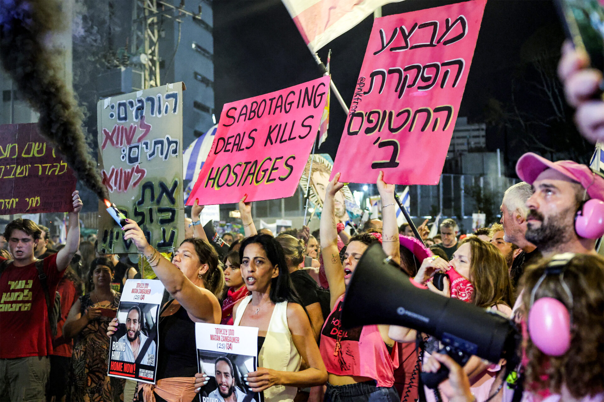 ผู้ประท้วงหลายพันคนรวมตัวกันในเทลอาวีฟ เพื่อกดดันให้รัฐบาลยุติสงครามในฉนวนกาซาและบรรลุข้อตกลงในการส่งตัวประกันกลับประเทศ ในช่วงเวลาที่คณะรัฐมนตรีความมั่นคงกำลังประชุม