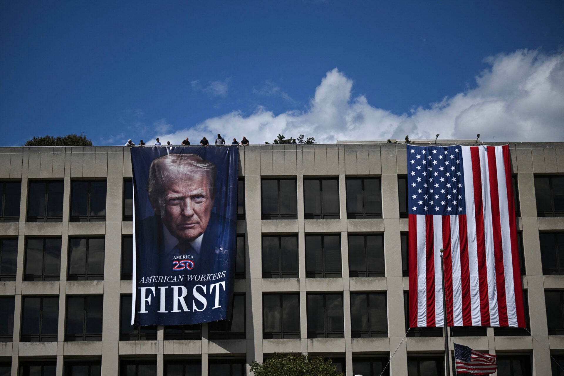 รูปถ่ายขนาดใหญ่ของประธานาธิบดีโดนัลด์ ทรัมป์ อยู่ข้างธงชาติสหรัฐอเมริกา ที่ด้านหน้าอาคารสำนักงานใหญ่ของกระทรวงแรงงาน ในกรุงวอชิงตัน ดี.ซี. เมื่อวันที่ 27 สิงหาคม (Photo by Drew ANGERER / AFP)