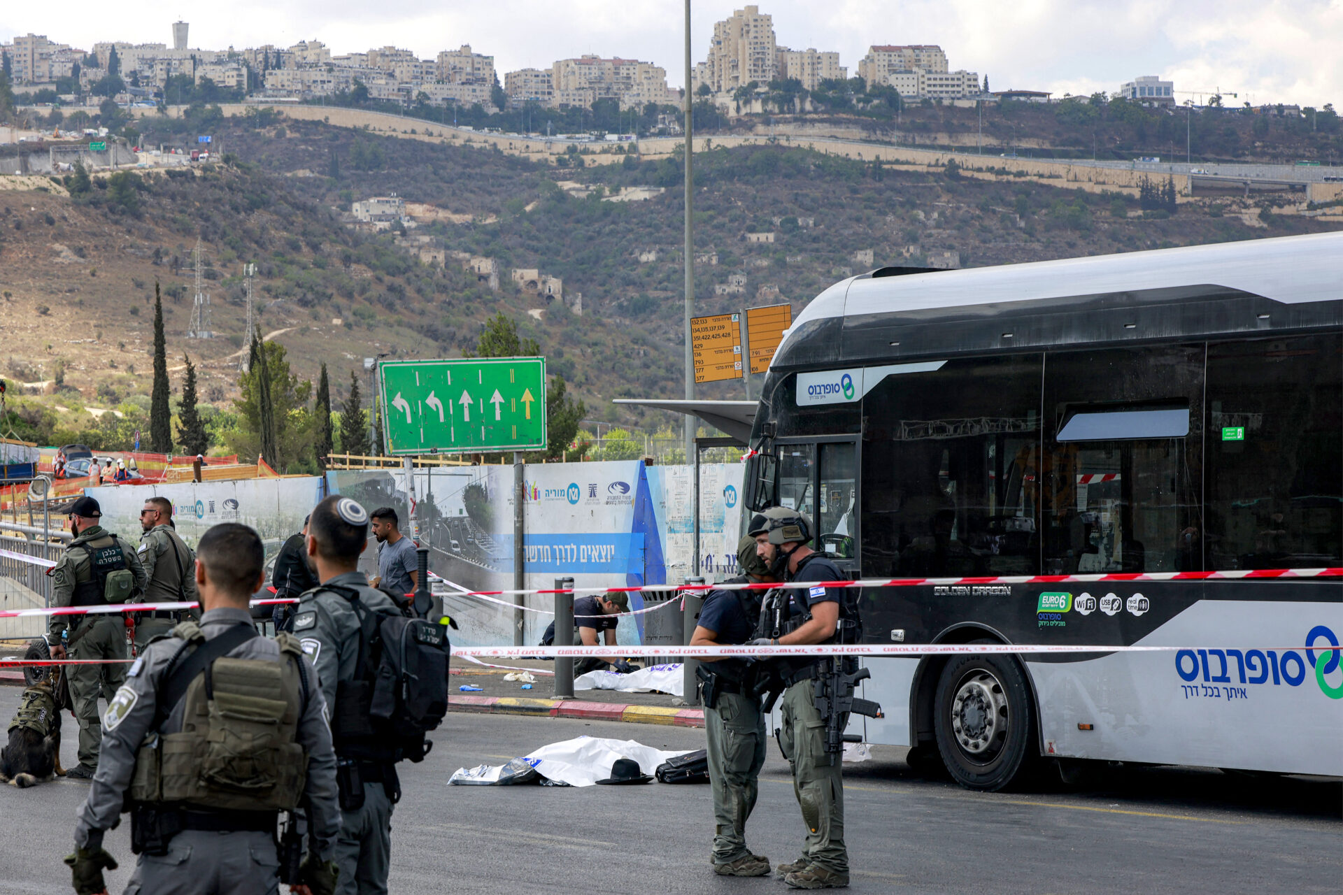 กองกำลังความมั่นคงของอิสราเอลรวมตัวกันข้างรถบัส ณ จุดเกิดเหตุยิงกันที่ทางแยกราม็อต ในเยรูซาเลมตะวันออกที่เป็นดินแดนผนวกของอิสราเอล เมื่อวันที่ 8 กันยายน (Photo by Menahem Kahana / AFP)
