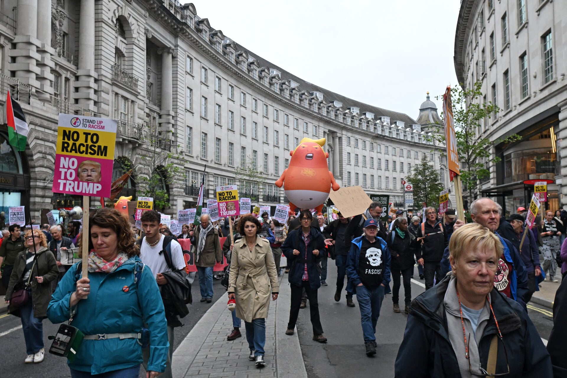 ท่ามกลางเสียงกลองที่ดังสนั่นหวั่นไหว ผู้ประท้วงบางส่วนได้จำลองลูกโป่งขนาดเล็กที่เป็นรูปทรัมป์กำลังสวมผ้าอ้อม ซึ่งเป็นการล้อเลียนตั้งแต่สมัยแรกที่ทรัมป์มาเยือนสหราชอาณาจักรครั้งแรกในปี 2019