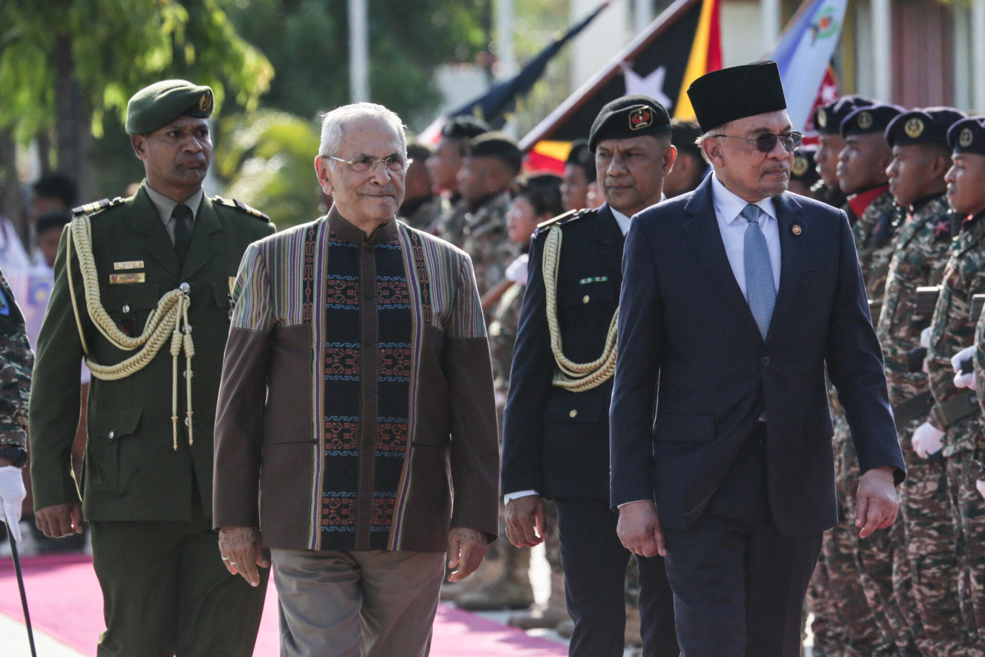 นายกรัฐมนตรีอันวาร์ อิบราฮิม ของมาเลเซีย (ขวา) และประธานาธิบดีโฮเซ รามอส-ฮอร์ตา ของติมอร์ตะวันออก (ที่ 2 จากซ้าย) ตรวจตรากองทหารเกียรติยศที่ทำเนียบประธานาธิบดีในเมืองหลวงดิลี ประเทศติมอร์ตะวันออก เมื่อวันที่ 23 กันยายน (Photo by Valentino Dariell DE SOUSA / AFP)