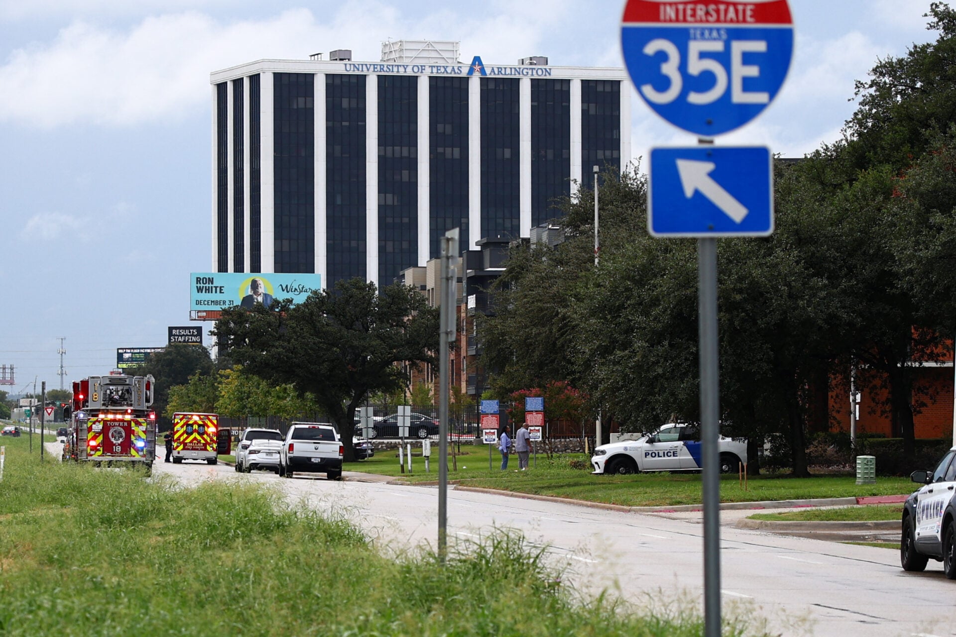 เจ้าหน้าที่บังคับใช้กฎหมายและเจ้าหน้าที่ฉุกเฉินเข้าควบคุมพื้นที่ใกล้จุดเกิดเหตุยิงกันที่สถานกักกันของสำนักงานตรวจคนเข้าเมืองและศุลกากรสหรัฐฯ (ICE) ในเมืองดัลลัส รัฐเท็กซัส เมื่อวันที่ 24 กันยายน (Photo by Aric Becker / AFP)