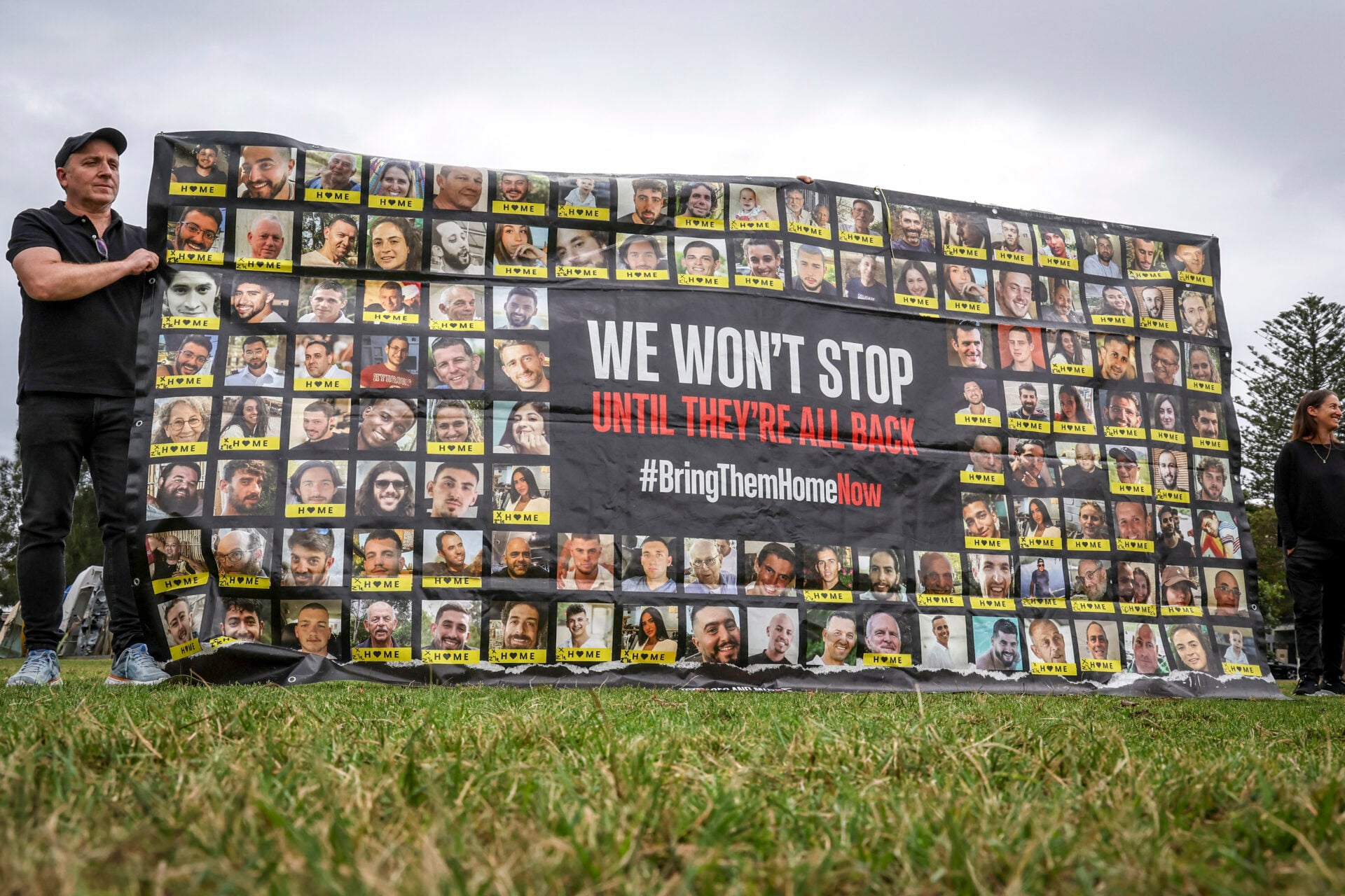 ป้ายรูปชาวอิสราเอลที่ถูกกลุ่มติดอาวุธฮามาสจับเป็นตัวประกันในฉนวนกาซา เพื่อรำลึกครบรอบสองปีของสงคราม เมื่อวันที่ 7 ตุลาคม (Photo by DAVID GRAY / AFP)