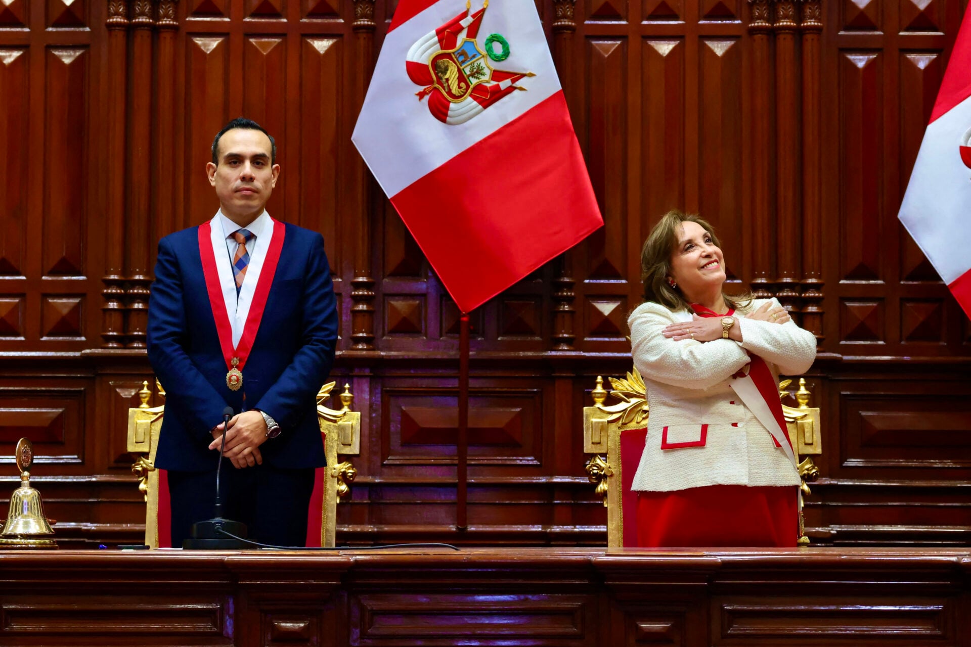 แฟ้มภาพ ประธานาธิบดีดีนา โบลูอาร์เต (ขวา) ของเปรู กำลังทำท่าทางประกอบในขณะยืนคู่กับโฮเซ เฌรี โอเร ประธานรัฐสภาเปรู ก่อนการกล่าวสุนทรพจน์ต่อประชาชน เนื่องในวันประกาศอิสรภาพ ณ รัฐสภาแห่งชาติในกรุงลิมา (Photo byJAIRO DIAZ / PERUVIAN PRESIDENCY / AFP)