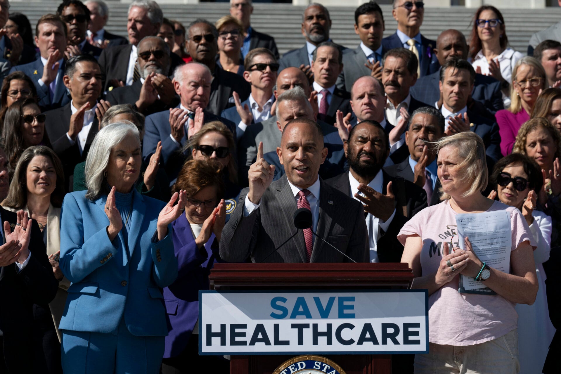 ฮาคีม เจฟฟรีส์ ผู้นำเสียงข้างน้อยในสภาผู้แทนราษฎรสหรัฐฯ และสมาชิกพรรคเดโมแครตจากนิวยอร์ก กำลังกล่าวสุนทรพจน์ร่วมกับสมาชิกสภาผู้แทนราษฎรพรรคเดโมแครตคนอื่นๆ บนบันไดรัฐสภาสหรัฐฯ เมื่อวันที่ 15 ตุลาคม ท่ามกลางภาวะชัตดาวน์ของรัฐบาลสหรัฐฯ ที่ยืดเยื้อเข้าสู่สัปดาห์ที่สาม (Photo by Roberto Schmidt / AFP)