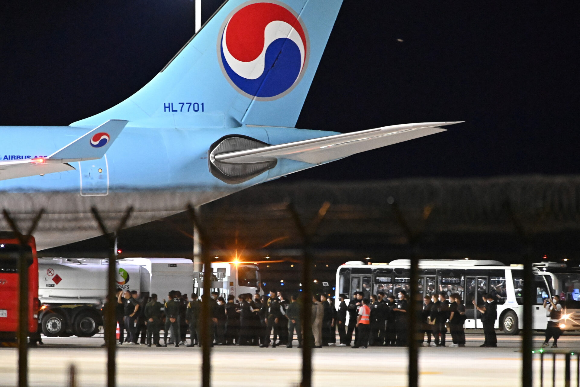 เจ้าหน้าที่ตำรวจกัมพูชาและเกาหลีใต้ยืนใกล้เครื่องบินโดยสารจากเกาหลีใต้ที่ถูกส่งมารับพลเมืองที่ถูกควบคุมตัวในปฏิบัติการปราบปรามอาชญากรรมของทางการกัมพูชา ณ สนามบินนานาชาติเตโช จังหวัดกันดาล ประเทศกัมพูชา เมื่อวันที่ 17 ตุลาคม (Photo by TANG CHHIN Sothy / AFP)