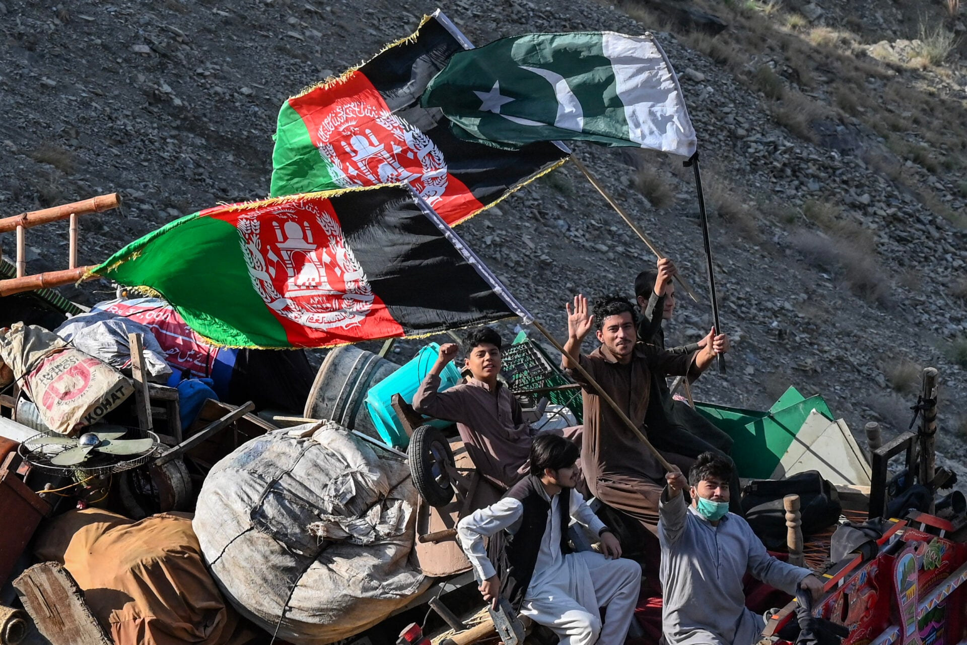 ผู้ลี้ภัยชาวอัฟกานิสถานโบกธงอัฟกานิสถานและปากีสถาน (Photo by Abdul MAJEED / AFP)