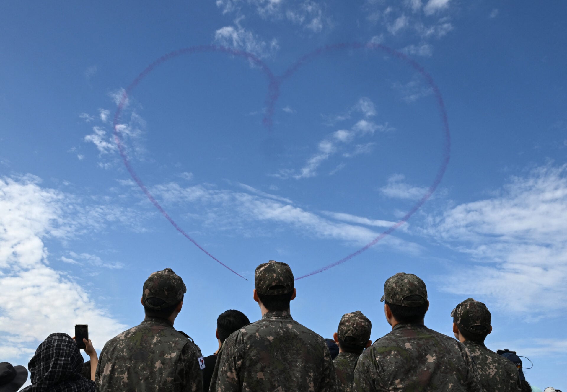 (แฟ้มภาพ) ทหารเกาหลีใต้เฝ้าดูจากลานจอดเครื่องบินขณะที่หน่วย Black Eagles ซึ่งเป็นหน่วยบินผาดโผนของเครื่องบินเจ็ท T-50 ของกองทัพอากาศเกาหลีใต้ บินเป็นรูปขบวนในงานนิทรรศการการบินและอวกาศและการป้องกันประเทศนานาชาติโซล (ADEX) ที่สนามบินทหารในเมืองซองนัม เมื่อวันที่ 17 ตุลาคม (Photo by Jung Yeon-je / AFP)