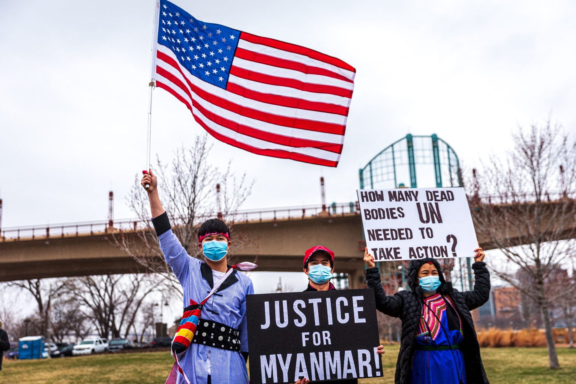 (แฟ้มภาพ) ผู้ประท้วงถือป้ายและโบกธงชาติสหรัฐฯ ระหว่างการประท้วง "วันปฏิวัติการประท้วงทั่วโลกเพื่อเมียนมา" ที่เกาะราสเบอร์รี่ ในแม่น้ำมิสซิสซิปปี ประเทศสหรัฐอเมริกา (Photo by Kerem Yucel / AFP)