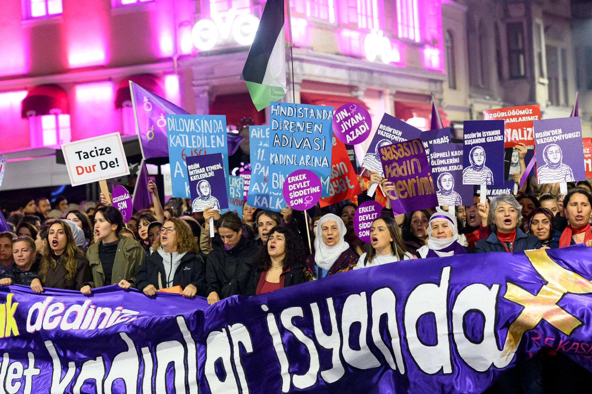 ผู้ประท้วงราวสองพันคนได้รวมตัวกันที่อิสตันบูล เพื่อประณามความรุนแรงบนพื้นฐานทางเพศสภาพในตุรเคีย ซึ่งคดีฆาตกรรมผู้หญิงประมาณครึ่งหนึ่งยังคงไม่ได้รับการคลี่คลาย