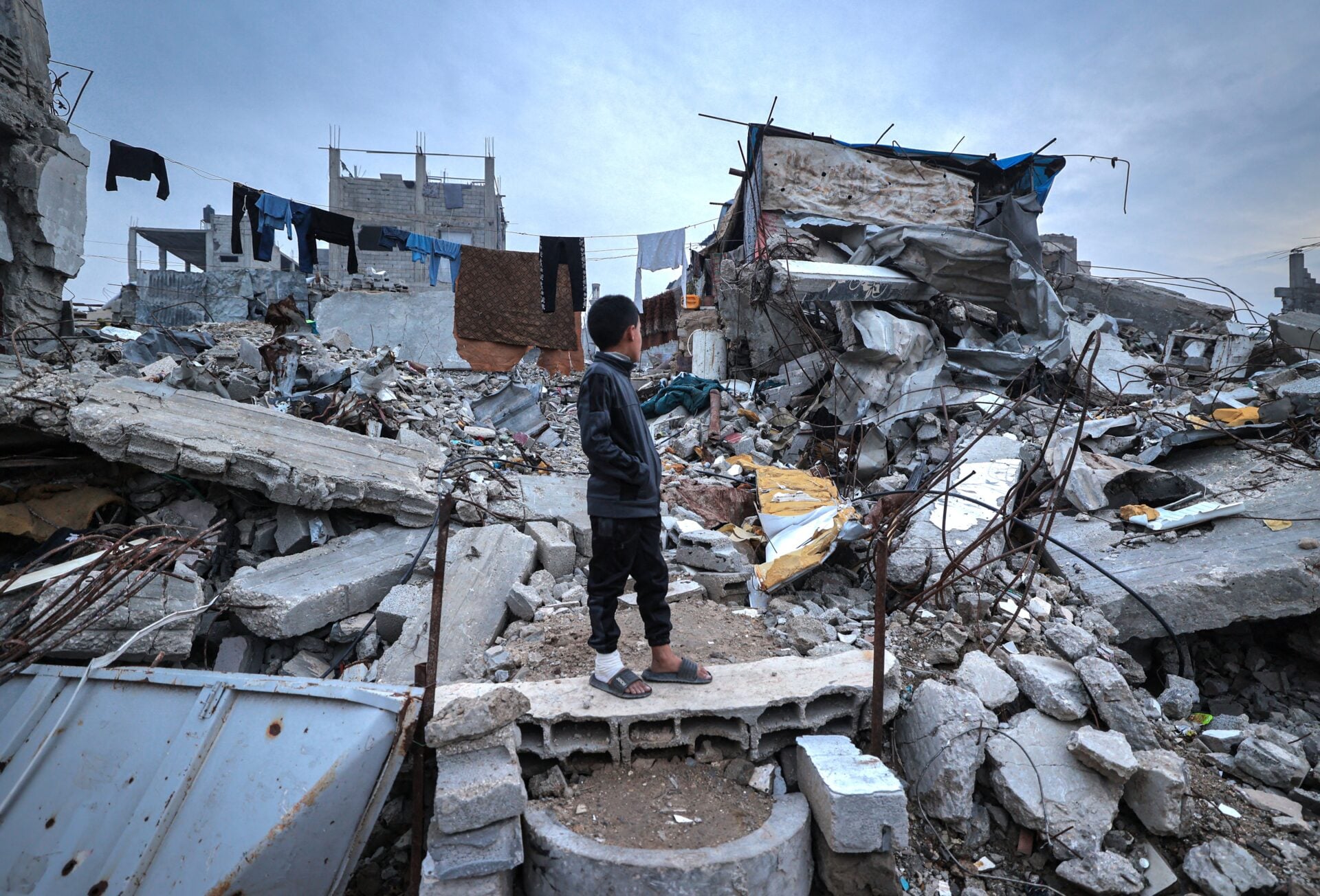 เด็กชายชาวปาเลสไตน์ผู้พลัดถิ่นยืนอยู่บนซากปรักหักพังของอาคารที่ถูกทำลายในค่ายผู้ลี้ภัยบูเรจ ใจกลางฉนวนกาซา เมื่อวันที่ 29 พฤศจิกายน (Photo by Eyad Baba / AFP)
