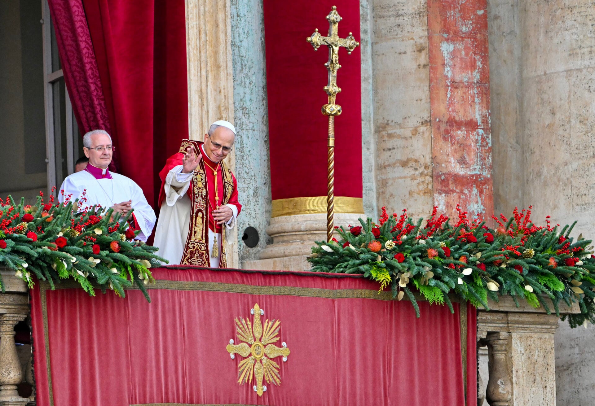 สมเด็จพระสันตะปาปาเลโอที่ 14 ทรงโบกพระหัตถ์ให้บรรดาผู้ศรัทธาและศาสนิกชนที่ระเบียงหลักของมหาวิหารเซนต์ปีเตอร์ ก่อนประทารพร "Urbi et Orbi" แก่นครวาติกันและโลก ในฐานะส่วนหนึ่งของการเฉลิมฉลองคริสต์มาส ณ จัตุรัสเซนต์ปีเตอร์ในนครวาติกัน เมื่อวันที่ 25 ธันวาคม (Photo by Andreas SOLARO / AFP)