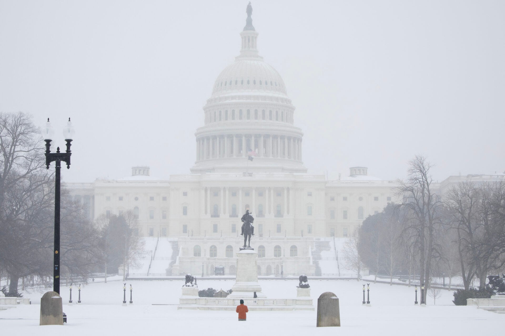 อาคารรัฐสภาสหรัฐฯ ถูกปกคลุมด้วยหิมะที่ตกหนักในกรุงวอชิงตัน ดี.ซี. เมื่อวันที่ 25 มกราคม (Photo by Amid FARAHI / AFP)