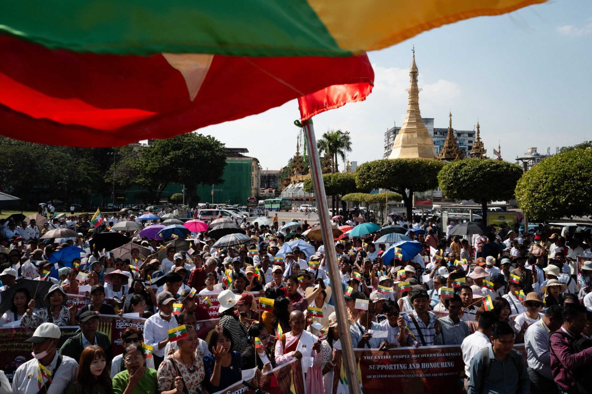ในใจกลางเมืองย่างกุ้ง ฝูงชนนักเคลื่อนไหวชาตินิยมและพระสงฆ์ในชุดจีวรสีเหลืองโบกธงชาติขนาดเล็กและถือป้ายปฏิเสธข้อกล่าวหาเรื่องการล้างเผ่าพันธุ์ที่ถูกกล่าวหาต่อศาลโลกในกรุงเฮก