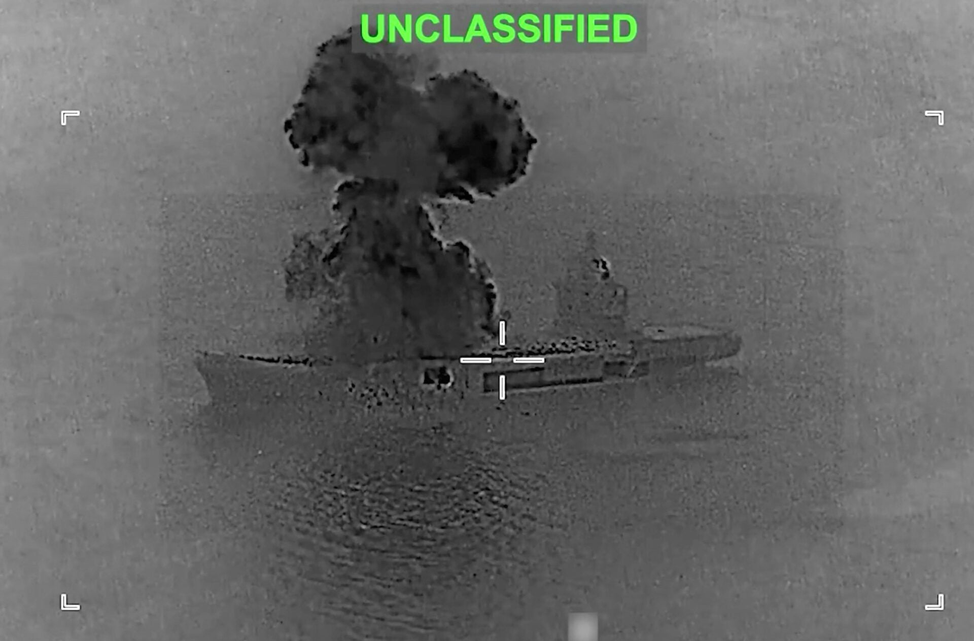 ภาพหน้าจอที่เผยแพร่โดยกองบัญชาการกลางสหรัฐฯ (CENTCOM) แสดงให้เห็นการโจมตีเรือลำหนึ่งในปฏิบัติการ "Operation Epic Fury" เมื่อวันที่ 5 มีนาคม (Photo by US Central Command (CENTCOM) / AFP)