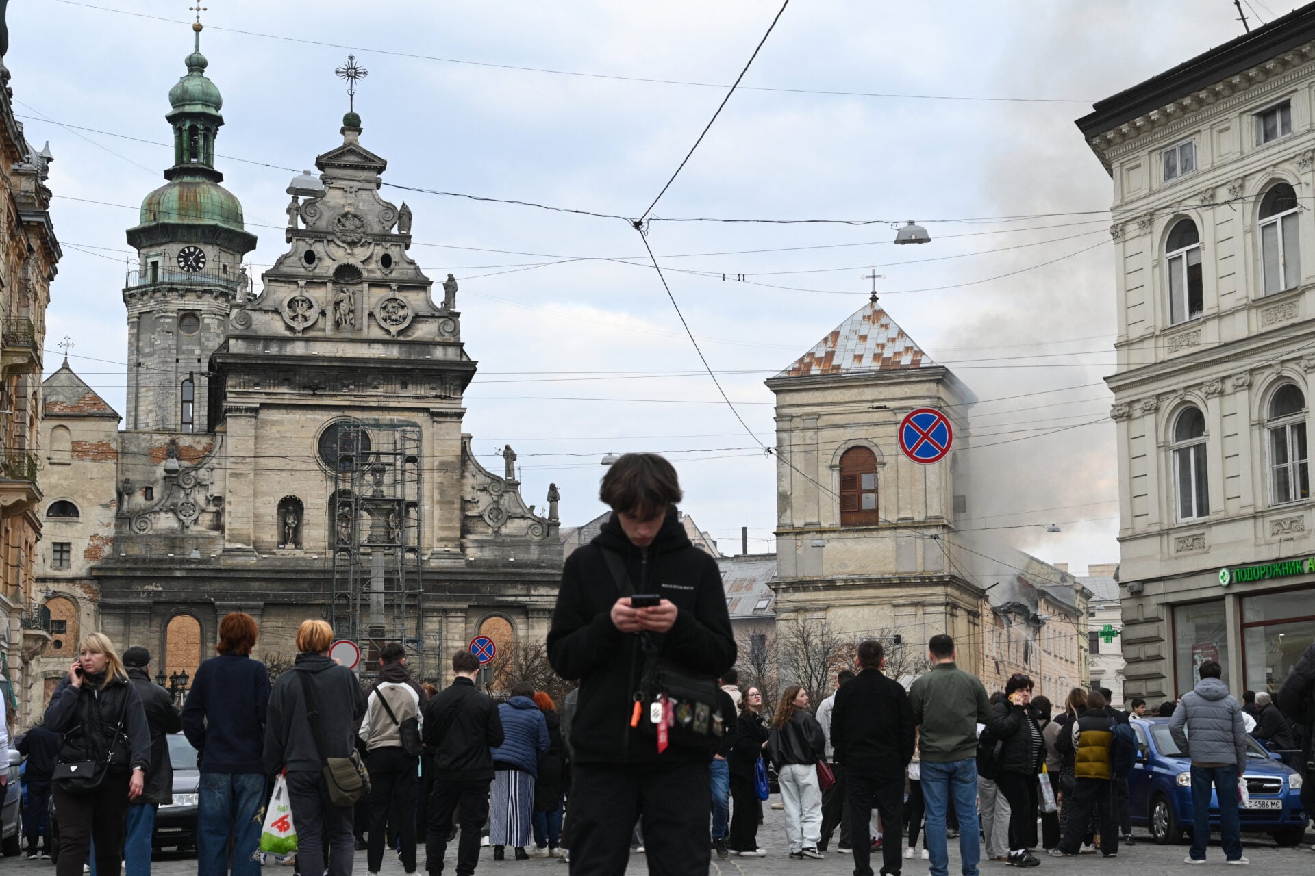 ในเมืองลวิฟ ทางตะวันตกของยูเครน ซึ่งอยู่ห่างไกลจากแนวหน้า ผู้สื่อข่าวของเอเอฟพีเห็นเปลวไฟลุกโชนขึ้นจากอาคารหลังหนึ่งที่อยู่ติดกับโบสถ์เซนต์แอนดรูว์และอารามเบอร์นาร์ดีนจากศตวรรษที่ 17 ในใจกลางเมือง