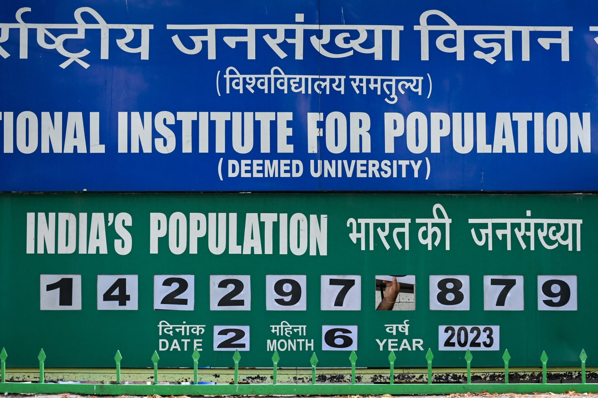 แฟ้มภาพ กระดานนาฬิกาประชากรที่จัดแสดงอยู่ด้านนอกสถาบันวิทยาศาสตร์ประชากรนานาชาติ (IIPS) ในเมืองมุมไบ ประเทศอินเดีย เมื่อวันที่ 2 มิถุนายน 2023 (Photo by Punit PARANJPE / AFP)