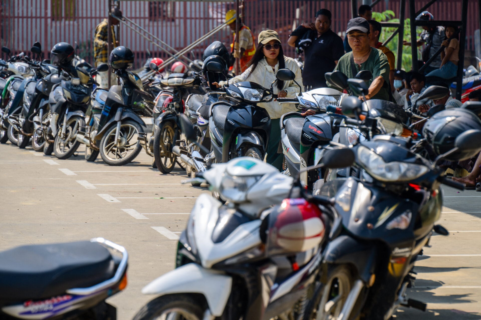 ผู้ขับขี่รถจักรยานยนต์ต่อแถวเพื่อเติมน้ำมัน นอกสถานีบริการน้ำมันในกรุงเนปยีดอ ประเทศเมียนมา เมื่อวันที่ 29 มีนาคม (Photo by ANTHONY WALLACE / AFP)