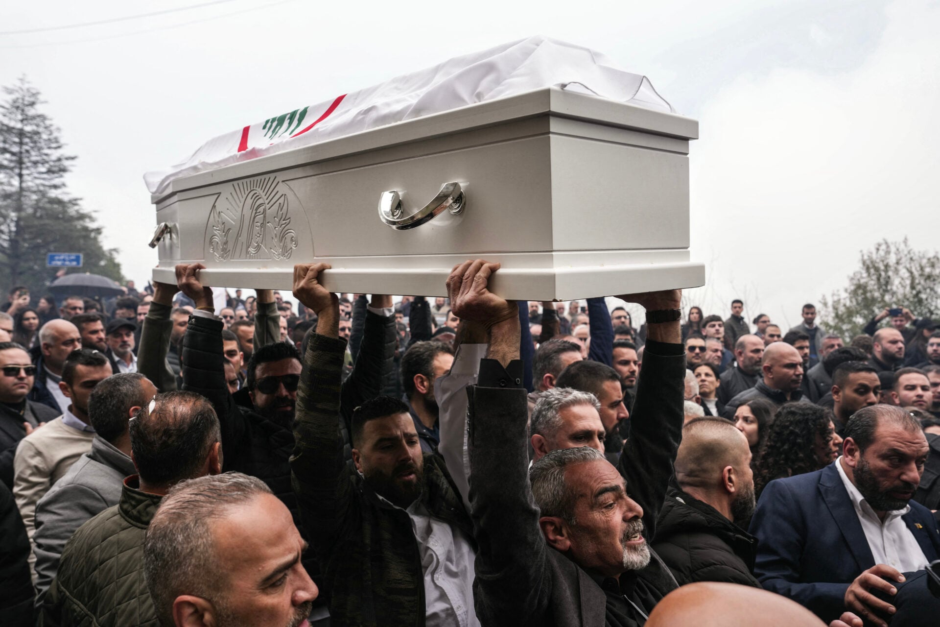 ผู้ไว้ทุกข์แบกโลงศพในพิธีศพของปิแอร์ มูอาวัดและภรรยา ซึ่งทั้งคู่เสียชีวิตจากการโจมตีของอิสราเอลในเมืองอีน ซาอาเดห์ ประเทศเลบานอน เมื่อวันที่ 7 เมษายน (Photo by Dimitar DILKOFF / AFP)