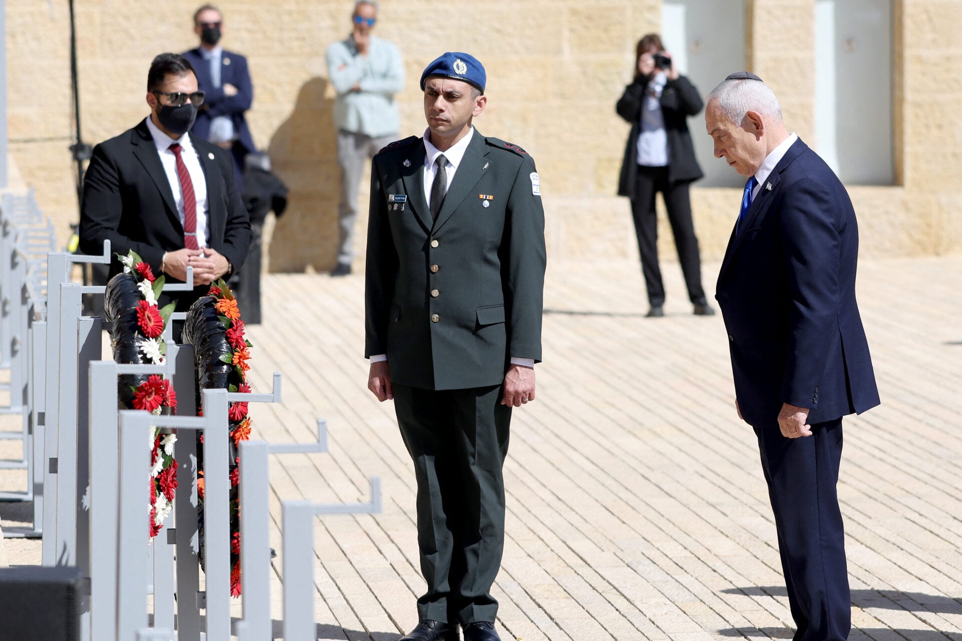 นายกรัฐมนตรีเบนจามิน เนทันยาฮู ของอิสราเอล (ขวาสุด) เข้าร่วมพิธีวางพวงมาลาเพื่อรำลึกถึงวันโฮโลคอสต์ (วันรำลึกถึงเหตุการณ์ฆ่าล้างเผ่าพันธุ์ชาวยิวสากล) ประจำปี ณ พิพิธภัณฑ์อนุสรณ์สถานโฮโลคอสต์ยาด วาเชม ในกรุงเยรูซาเลม เมื่อวันที่ 14 เมษายน (Photo by Ilia YEFIMOVICH / AFP)