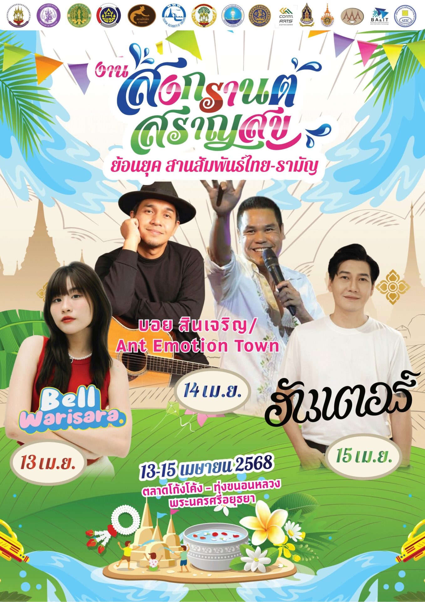 บอย สินเจริญ เจ้าของเพลงโดนใจ 'สัญญา' และ Ant Emotion Town เจ้าของเพลงฮิต 'เหตุเกิดจากความเหงา' เป็นการขึ้นเวทีคู่กัน ของ 2 ศิลปินแห่งยุค 90's ที่จะมาร่วมกันสร้างความพิเศษ ด้วยการมอบบทเพลงแห่งความสุข ให้กับชาวอยุธยา รวมถึงนักท่องเที่ยวในเทศกาลมหาสงกรานต์ ส่วนวันที่ 15 เม.ย. 68 ฮันเตอร์ ศิลปินสายอะคูสติกโฟล์ค ที่มีผลงานเพลงเป็นที่รู้จักอย่าง ท็อปในรุ่น, สาบานได้เลย ที่โด่งดังเป็นไวรัลทั่วประเทศ กับจังหวะเพลงที่โยกตามได้เพลิน ๆ