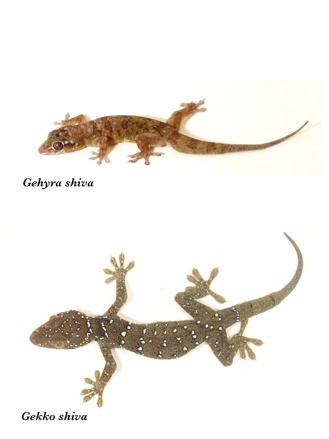 ส่วน”ตุ๊กแกศิวะ” มีขนาดใหญ่กว่า ความยาวลำตัวสูงสุดถึง 131.9 มม. มีดวงตาสีเขียวอมเหลืองที่เปล่งประกายในความมืด ลายจุดสีขาวที่กระจายบนตัวคล้ายสัญลักษณ์โบราณแห่งธรรมชาติ หลบซ่อนอยู่ในป่าหินปูน ออกหากินเวลากลางคืน แต่ยังไม่เคยพบในเขตที่อยู่อาศัยของมนุษย์