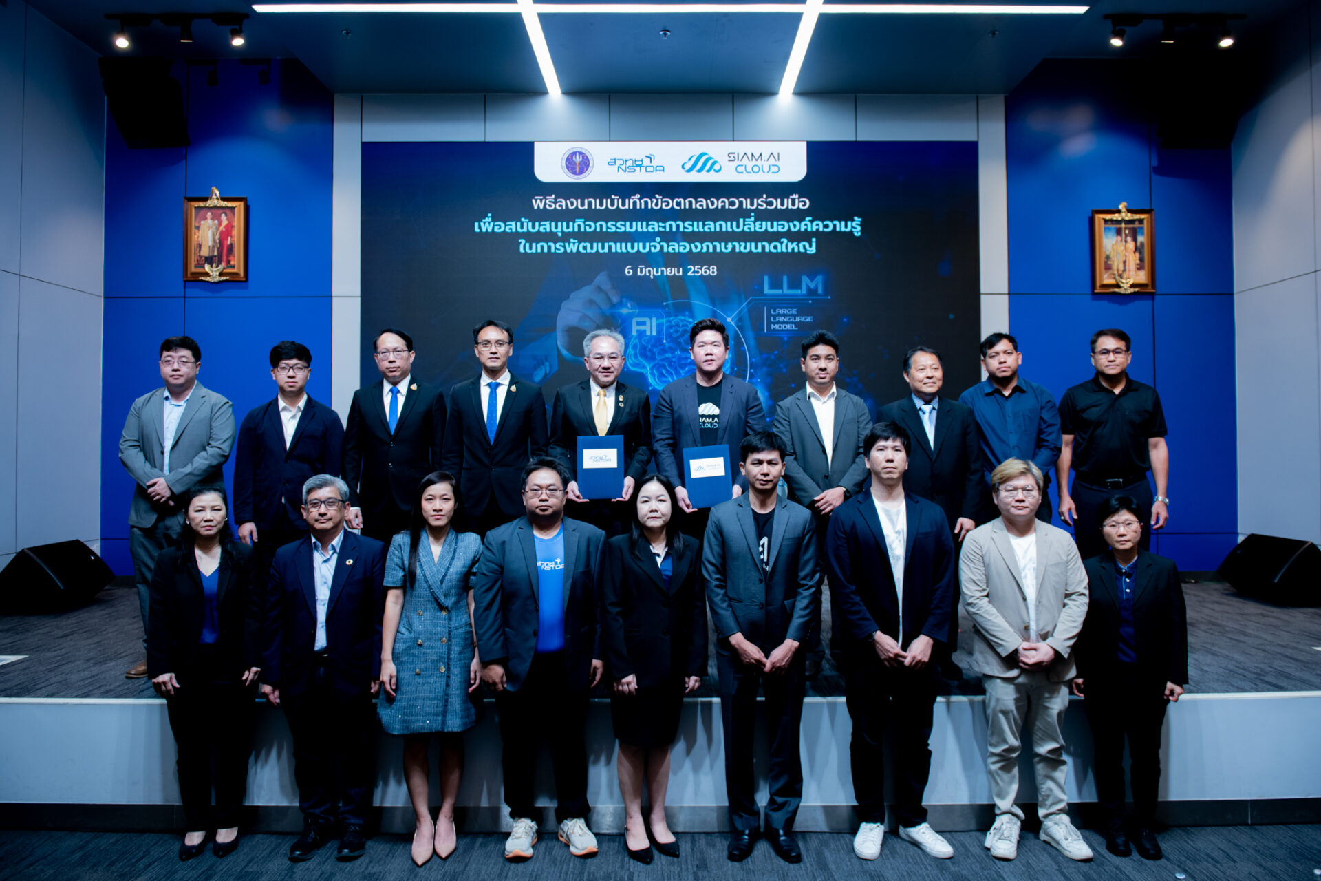 สำนักงานพัฒนาวิทยาศาสตร์และเทคโนโลยีแห่งชาติ โดยศูนย์เทคโนโลยีอิเล็กทรอนิกส์และคอมพิวเตอร์แห่งชาติ (เนคเทค) จัดงาน “Thai LLM และความท้าทายโครงสร้างพื้นฐานดิจิทัลของประเทศไทย” พร้อมทั้งพิธีลงนามบันทึกข้อตกลงความร่วมมือด้านการวิจัยและพัฒนาด้านปัญญาประดิษฐ์ เพื่อสนับสนุนกิจกรรมและการแลกเปลี่ยนองค์ความรู้ในการพัฒนาแบบจำลองภาษาขนาดใหญ่ (Large Language Model: LLM) โดยมีศ. ดร.ชูกิจ ลิมปิจำนงค์ ผู้อำนวยการ สวทช. และ นายรัตนพล วงศ์นภาจันทร์ ประธานกรรมการบริหาร บริษัท สยาม เอไอ คอร์เปอเรชั่น จำกัด ร่วมลงนามบันทึกข้อตกลงความร่วมมือด้านการวิจัยและพัฒนาปัญญาประดิษฐ์ เพื่อสนับสนุนการพัฒนาแบบจำลองภาษาขนาดใหญ่ โดยเฉพาะ Thai LLM ที่เข้าใจบริบทและวัฒนธรรมไทยอย่างแท้จริง และมีนายณัฐพงษ์ ช่วยบำรุง Chief Technology Officer พร้อมด้วย ดร.ชัย วุฒิวิวัฒน์ชัย ผู้อำนวยการเนคเทค สวทช. ร่วมเป็นสักขีพยาน