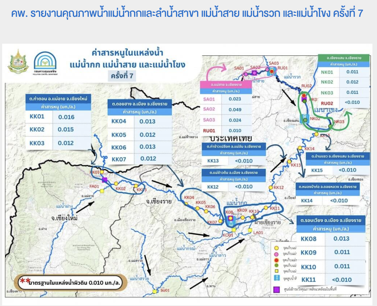 คพ.เผยผลตรวจน้ำกก-สาย-รวก-โขง ครั้งที่ 7 ล่าสุดก่อนฝนตกหนัก พบสารหนูยังเกินค่ามาตรฐานแทบทุกจุด แต่ยังไม่เปิดเผยค่าสารตะกั่ว-แมงกานีส