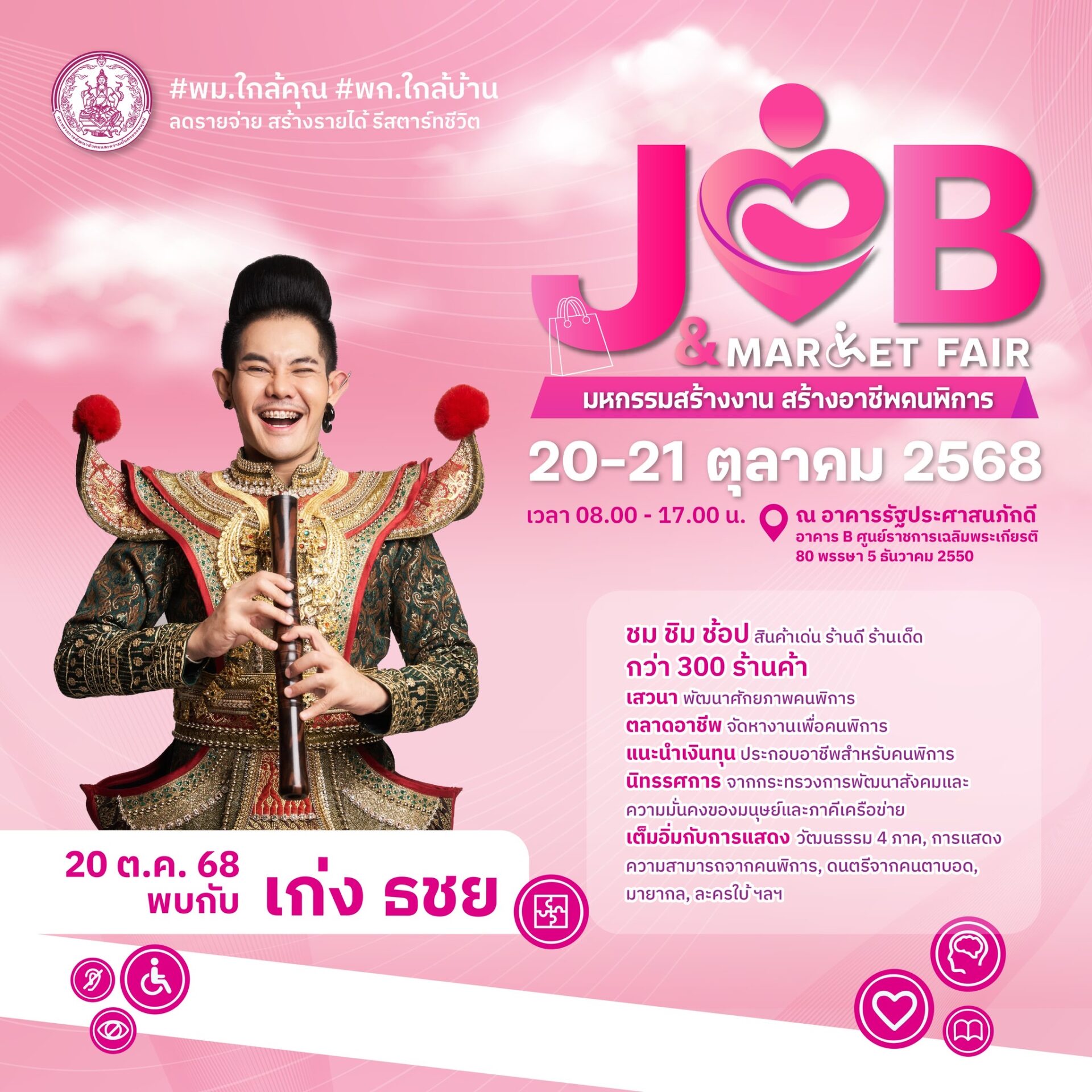 19 ตุลาคม 2568 - กระทรวงการพัฒนาสังคมและความมั่นคงของมนุษย์ (พม.) โดยกรมส่งเสริมและพัฒนาคุณภาพชีวิตคนพิการ (พก.) เตรียมจัดงาน “Job & Market Fair : มหกรรมสร้างงาน สร้างอาชีพคนพิการ” ระหว่างวันที่ 20–21 ตุลาคม 2568 ณ อาคารรัฐประศาสนภักดี (อาคาร B) ศูนย์ราชการเฉลิมพระเกียรติ ฯ แจ้งวัฒนะ กรุงเทพ ฯ ภายใต้นโยบายของนายอัครา พรหมเผ่า รัฐมนตรีว่าการกระทรวงการพัฒนาสังคมและความมั่นคงของมนุษย์ (พม.) “พม.ใกล้คุณ พก.ใกล้บ้าน ลดรายจ่าย สร้างรายได้ รีสตาร์ทชีวิต” เพื่อสร้างโอกาสที่ยั่งยืนให้แก่คนพิการและครอบครัว ผ่านความร่วมมือจากทุกภาคส่วน ทั้งภาครัฐ เอกชน สถาบันการศึกษา และภาคประชาสังคม โดยภายในงานจะมีตลาดอาชีพและสินค้าคนพิการกว่า 300 ร้านค้า , เวทีเสวนาและเวิร์กช็อปสร้างแรงบันดาลใจ ในการประกอบอาชีพยุคใหม่ , การสาธิตอาชีพเชิงสร้างสรรค์ , พิธีลงนาม MOU “เสริมสร้างโอกาสการจ้างงานและการประกอบอาชีพ” , พิธีมอบรางวัล “We Can Do” เชิดชูคนพิการต้นแบบ และหน่วยงานสนับสนุนงานด้านคนพิการ , นิทรรศการจาก พม. และภาคีเครือข่าย ถ่ายทอดนวัตกรรมและผลงานเด่น , การแสดงความสามารถของคนพิการ รวมถึงการแสดงทางวัฒนธรรมร่วมสมัย และมินิคอนเสิร์ตจากศิลปินชั้นนำ