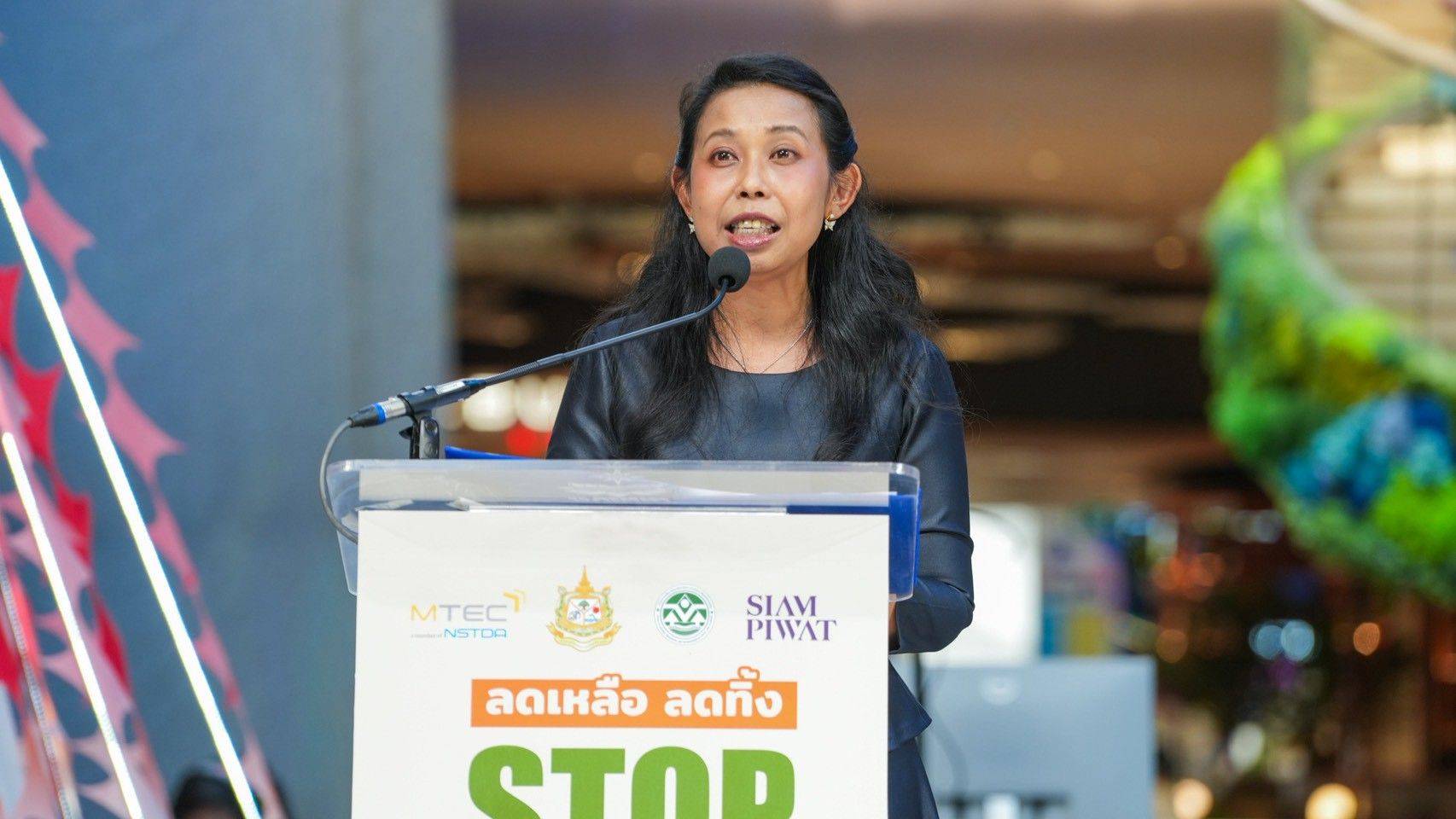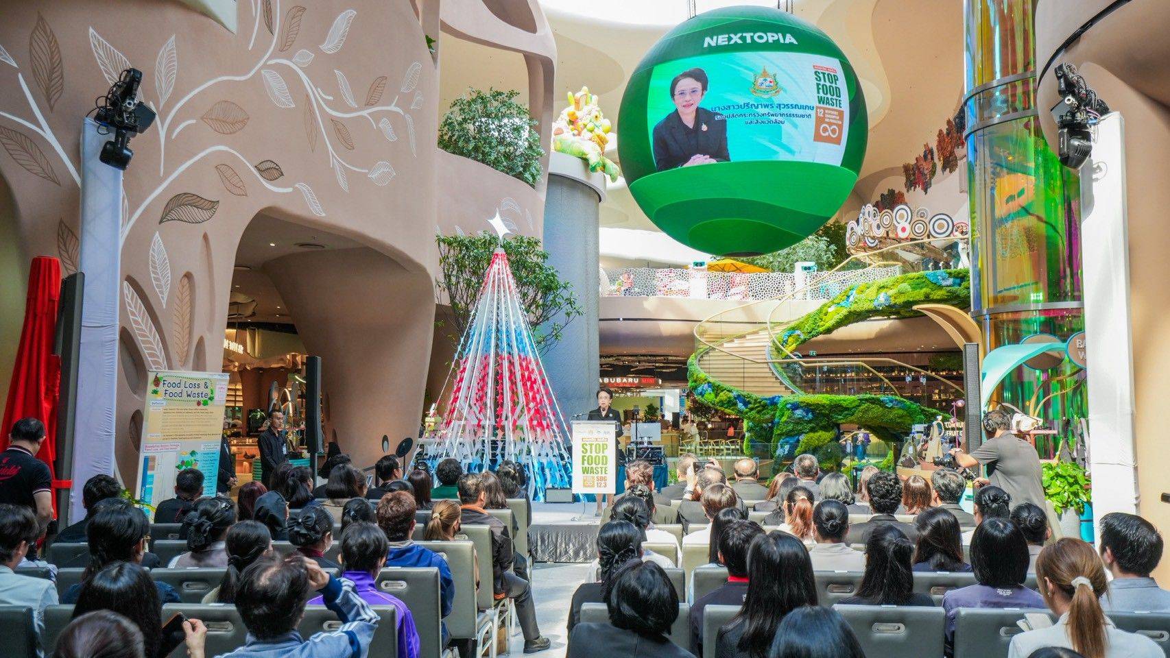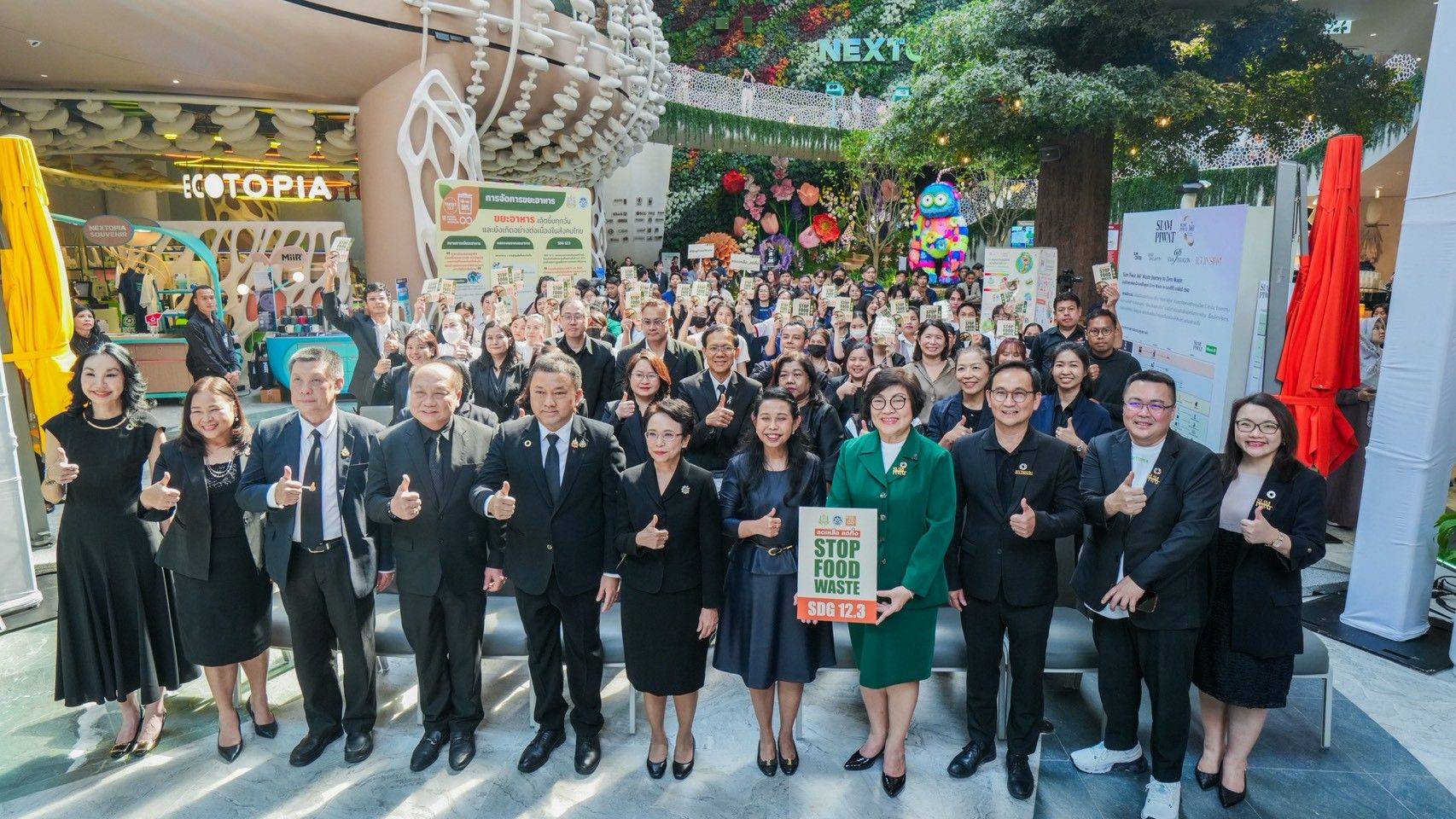 บรรยากาศงานเปิดตัวโครงการจัด ณ Event Area ชั้น 5 NEXTOPIA ศูนย์การค้าสยามพารากอน โดยสำนักงานนโยบายและแผนทรัพยากรธรรมชาติและสิ่งแวดล้อม (สผ.) ร่วมกับศูนย์เทคโนโลยีโลหะและวัสดุแห่งชาติ (MTEC) และสถาบันเทคโนโลยีและสารสนเทศเพื่อการพัฒนาที่ยั่งยืน ซึ่งเป็นภาคีเครือข่ายองค์กรนำร่องผู้สนับสนุน และบริษัทสยามพิวรรธน์ ในฐานะภาคีเครือข่ายองค์กรนำร่องผู้ปฏิบัติตามบันทึกความเข้าใจ เพื่อสร้างการมีส่วนร่วมของร้านอาหารภายในศูนย์การค้าในการลดขยะอาหารอย่างต่อเนื่อง