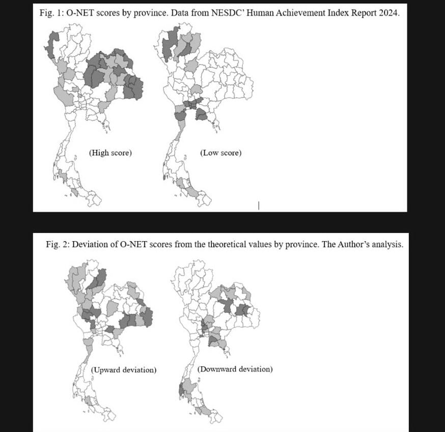 การกระจายค่าคะแนน O-NET ในระดับจังหวัด (รูปที่ 1) แสดงจังหวัดที่มีคะแนน O-NET สูงตั้งอยู่ในกรุงเทพมหานครและพื้นที่โดยรอบ และในภาคเหนือ รวมทั้งในบางจังหวัดภาคใต้ ในทางกลับกัน จังหวัดที่มีคะแนนต่ำจะกระจุกตัวอยู่ในภาคตะวันออกเฉียงเหนือและภาคเหนือที่ติดกับประเทศเมียนมาร์ รวมทั้งในบางจังหวัดภาคกลางและภาคใต้ และสามจังหวัดภาคใต้