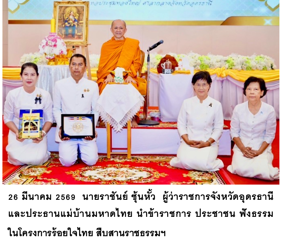 เจริญพรสาธุชนผู้มีจิตศรัทธาในพระพุทธศาสนา จากการไปปฏิบัติศาสนกิจใน โครงการร้อยใจไทย สืบสานราชธรรม ทั้งแผ่นดิน ถวายพระราชกุศล แด่ สมเด็จพระนางเจ้าสิริกิติ์ พระบรมราชินีนาถ พระบรมราชชนนีพันปีหลวง ในภาคอีสานตอนเหนือ พื้นที่ จ.สกลนคร, จ.อุดรธานี, จ.หนองคาย และ จ.เลย โดยมี ว่าที่พันตรีอดิศักดิ์ น้อยสุวรรณ ผู้ว่าราชการจังหวัดนครพนม เข้าร่วมที่ จ.สกลนคร ระหว่างวันที่ ๒๓-๒๘ มีนาคม ๒๕๖๙ นับว่ามีประโยชน์อย่างยิ่ง ในการประกาศ ทศพิธราชธรรม ควบคู่กับ จักกวัตติธรรม ไปในท่ามกลางบุคคลที่ขานอาสาทำหน้าที่รับใช้แผ่นดิน.. บำบัดทุกข์ บำรุงสุข .. ประชาชน .. เจ้าของแผ่นดิน โดยมีผู้ว่าราชการจังหวัด นำข้าราชการในพื้นที่นั้นๆ เข้าร่วมขับเคลื่อนโครงการ เพื่อปลูกสร้างจิตสำนึก หัวใจนักปกครอง ที่จักต้องมี ราชธรรม ในการกล่อมเกลาจิตใจให้เหมาะสมกับการเป็น ข้าราชการ.. ที่ต้องมีอุดมการณ์ รัก.. ซื่อสัตย์.. รู้คุณ และตอบแทนคุณแผ่นดิน...