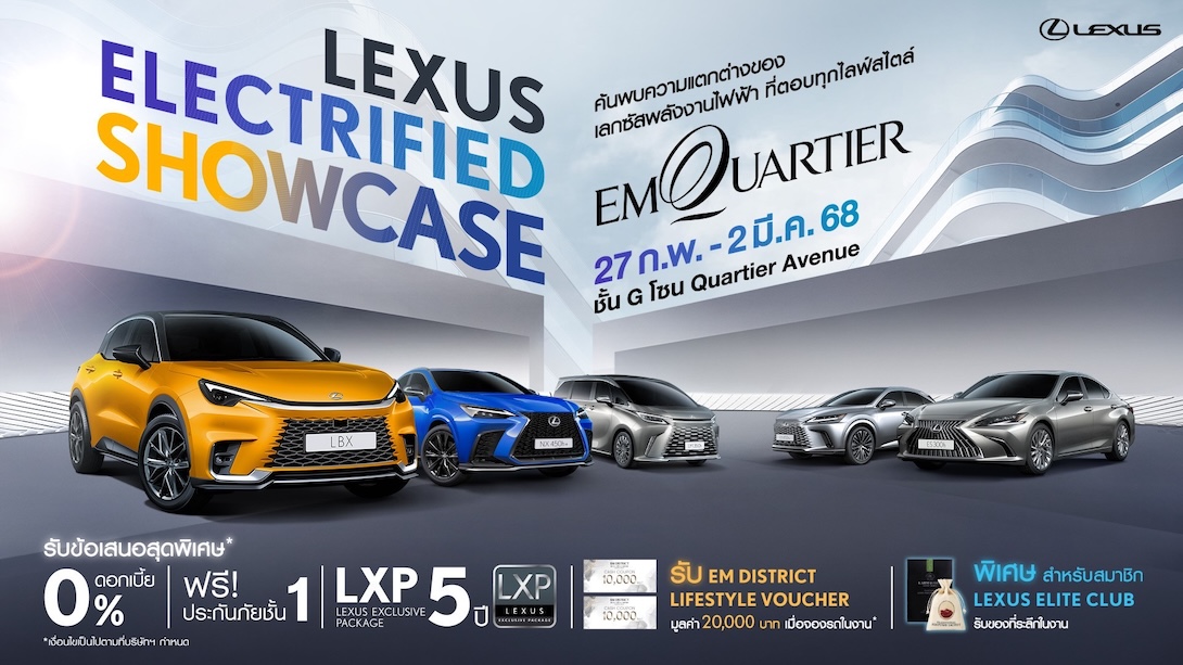 พบกันอีกครั้งกับกิจกรรม LEXUS ELECTRIFIED SHOWCASE โดยครั้งนี้เลกซัสยกขบวน ยนตรกรรมหรูหลากหลายรุ่นมาให้คุณได้สัมผัสถึงใจกลางเมือง ณ Emquartier โซน Quartier Avenue ชั้น G ตั้งแต่วันที่ 27 กุมภาพันธ์ – 2 มีนาคม 2568
