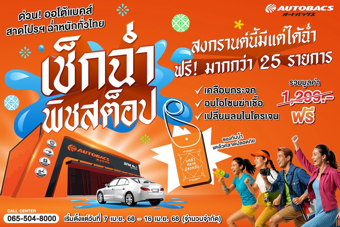 ออโต้แบคส์ ประเทศไทย (Autobacs Thailand) ศูนย์บริการบำรุงรักษารถยนต์ครบวงจร ในกลุ่มบริษัท พีทีจี เอ็นเนอยี จำกัด (มหาชน) หรือ PTG จัดโปรโมชั่นตลอดเทศกาลสงกรานต์ด้วยแคมเปญ “เช็กฉ่ำ พิชสต็อป” บริการตรวจเช็กรถฟรี มากกว่า 25 รายการ พร้อมรับของที่ระลึกสุดพิเศษ ตั้งแต่วันนี้ – 16 เมษายน 2568