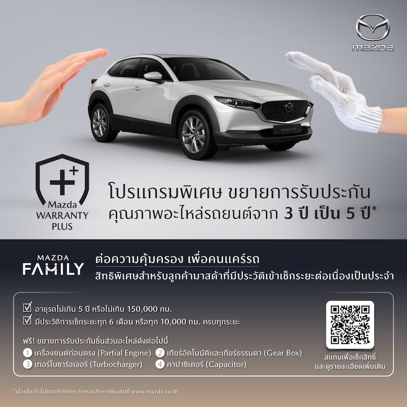 สำหรับโปรแกรมพิเศษ Mazda Warranty Plus เป็นโปรแกรมที่มาสด้าริเริ่มขึ้นใหม่ เพื่อมอบสิทธิพิเศษให้กับลูกค้า Mazda Family ด้วยการขยายการรับประกันคุณภาพอะไหล่รถยนต์จาก 3 ปี เป็น 5 ปี* สำหรับชิ้นส่วนเครื่องยนต์ท่อนตรง เกียร์อัตโนมัติและเกียร์ธรรมดา เทอร์โบชาร์จเจอร์ และคาปาซิเตอร์ โดยมีเงื่อนไขเพิ่มเติมเล็กน้อยคือเป็นรถยนต์ที่มีอายุไม่เกิน 5 ปี หรือไม่เกิน 150,000 กม. (แล้วแต่อย่างใดอย่างหนึ่งถึงก่อน) และมีประวัติการเข้าเช็กตามระยะครบตามกำหนดทุก 6 เดือน หรือทุก 10,000 กม. (แล้วแต่อย่างใดอย่างหนึ่งถึงก่อน) ครบทุกระยะ ซึ่งลูกค้าสามารถลงทะเบียนและตรวจสอบสิทธิพิเศษนี้ได้ตั้งแต่วันนี้ จนถึงวันที่ 31 ธันวาคม 2568 ที่ https://m.mazda.co.th/WarrantyPlusRegistration”