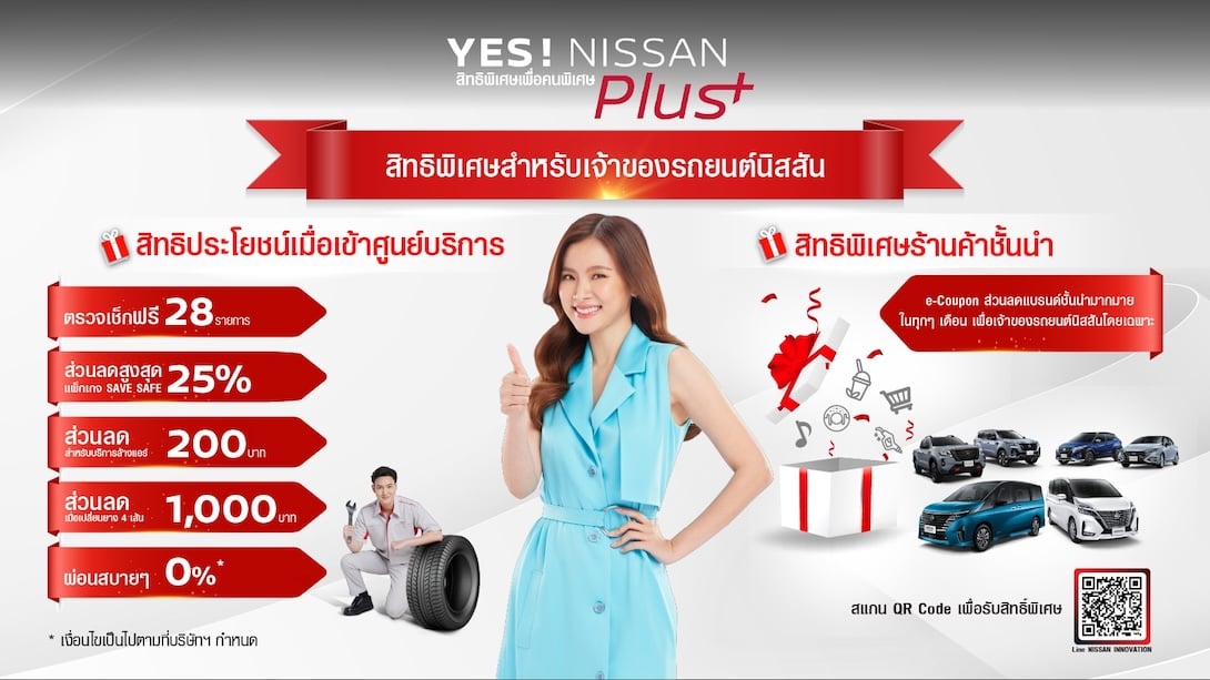 นิสสัน ประเทศไทย ยังคงมุ่งมั่นในการยกระดับประสบการณ์ของลูกค้าอย่างต่อเนื่อง ผ่านแคมเปญ “YES! NISSAN Plus - สิทธิพิเศษเพื่อคนพิเศษ” ด้วยโปรโมชันพิเศษจากศูนย์บริการ และแบรนด์ชั้นนำมากมาย ที่มอบความคุ้มค่าและความสะดวกสบายในทุกมิติของการใช้ชีวิต พร้อมตอบแทนความไว้วางใจของลูกค้าที่มีต่อแบรนด์มาอย่างยาวนาน